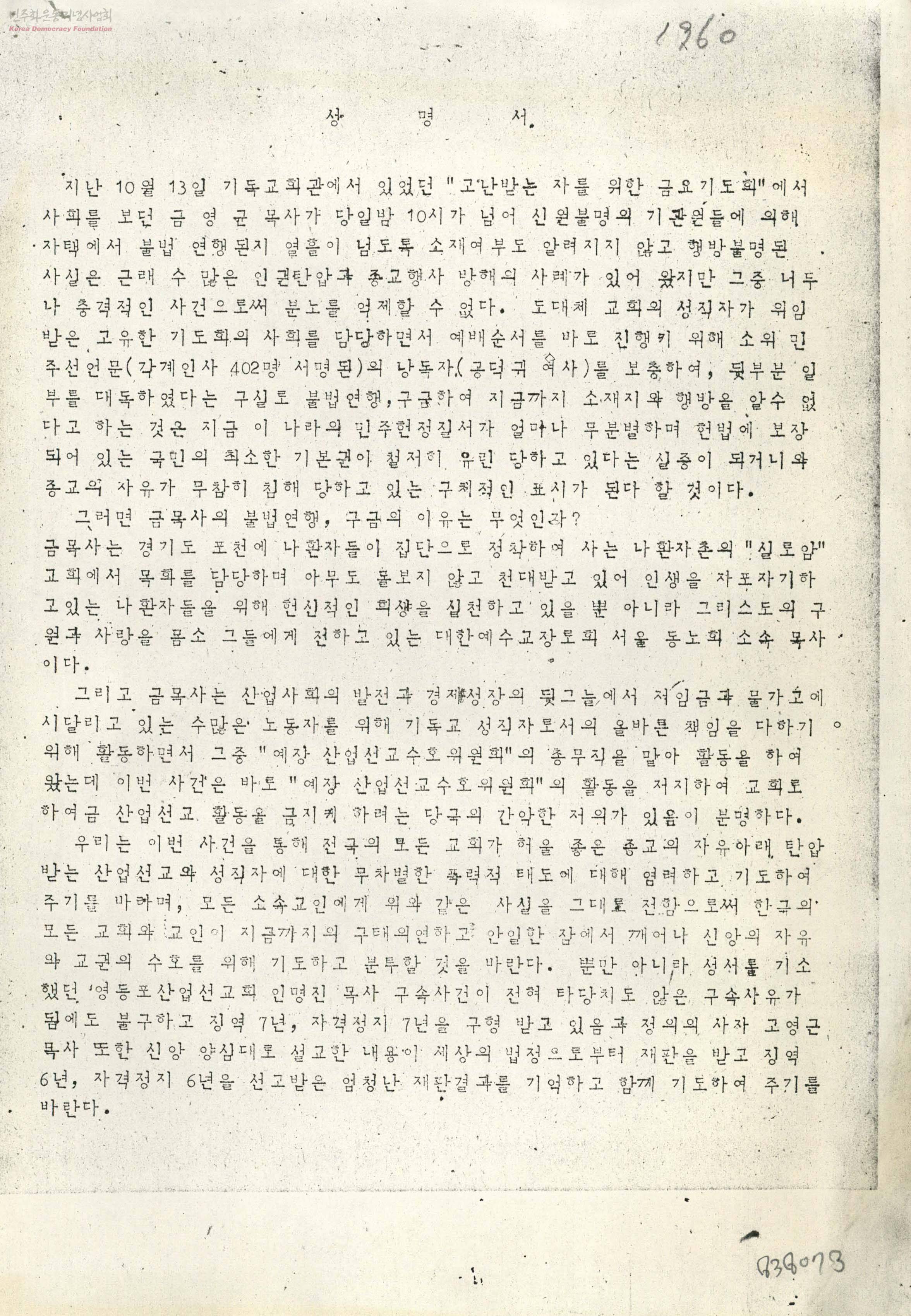 - "고난받는 자를 위한 금요기도회"에서 사회를 보던 금영균 목사가 불법연행된 사건에 관한 경위서와 금목사의 석방과 종교탄압을 중지할 것을 요구하는 내용.