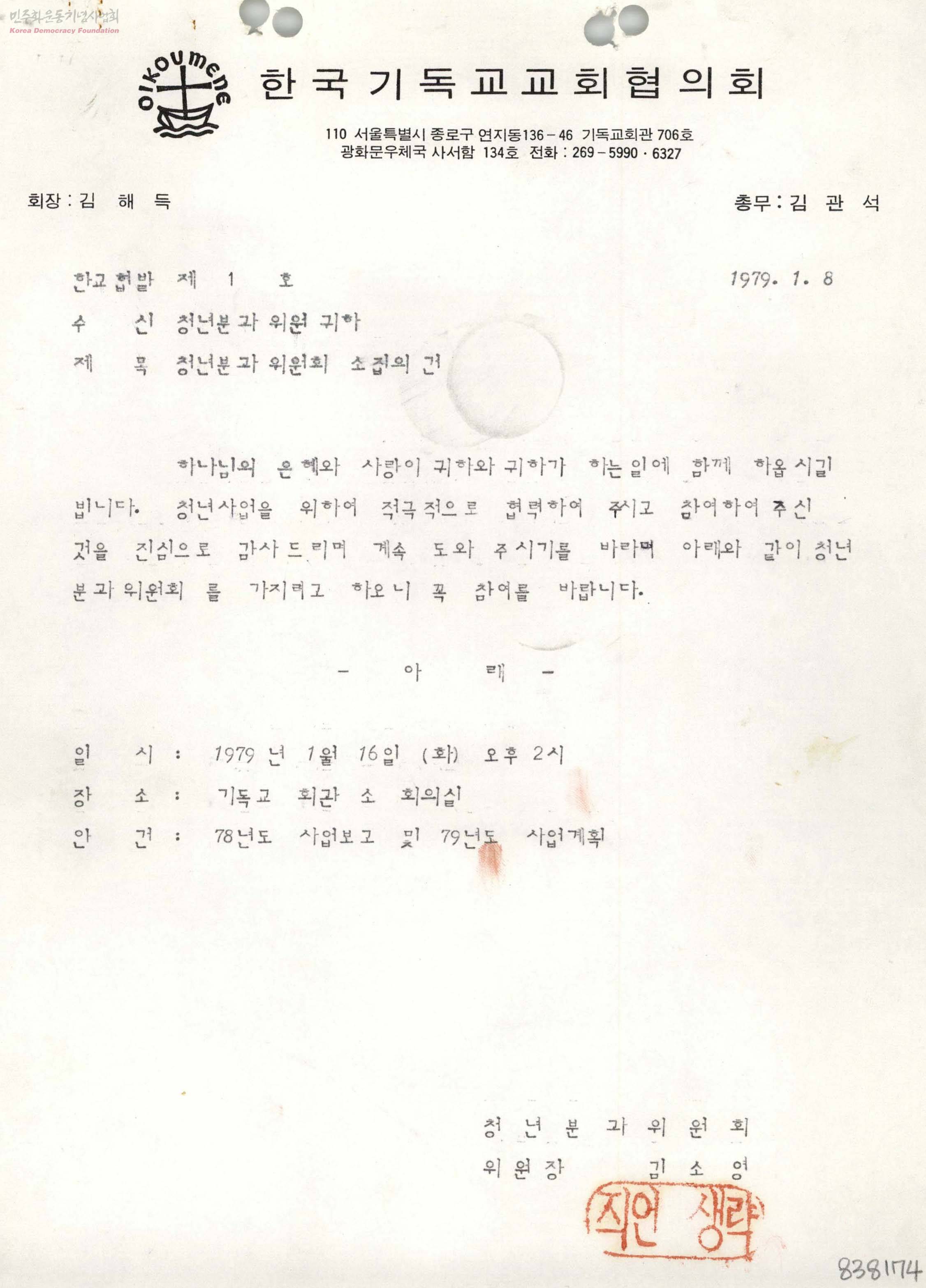 - *70-80년대 민주화운동 인권운동을 위해 앞장섰던 한국기독교교회협의회 관련 문서. 78년도 사업보고 및 79년도 사업계획을 위해 참여를 바라는 공문