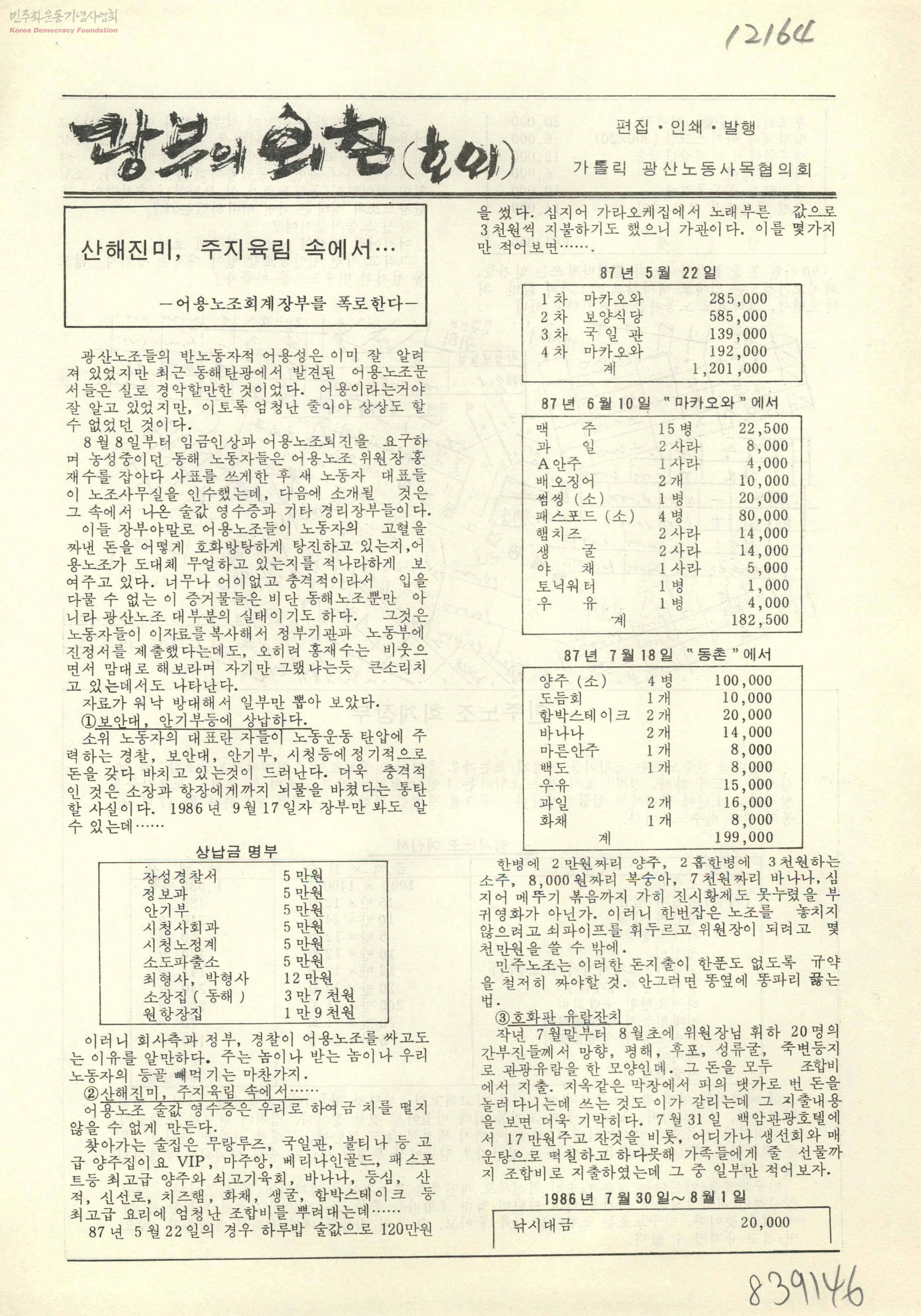 - 노동자들이 노동의 신성함과 존엄성을 인식하며, 소외된 노동의 가치와 보람을 일깨우기 위하여 조직된 '가톨릭노동사목전국협의회' 관련 내용. - 산해진미, 주지육림 속에서... - 어용노조회계장부를 폭로한다- 등 광산 노동자들을 위한 가톨릭노동사목협의회의 활동 내용.