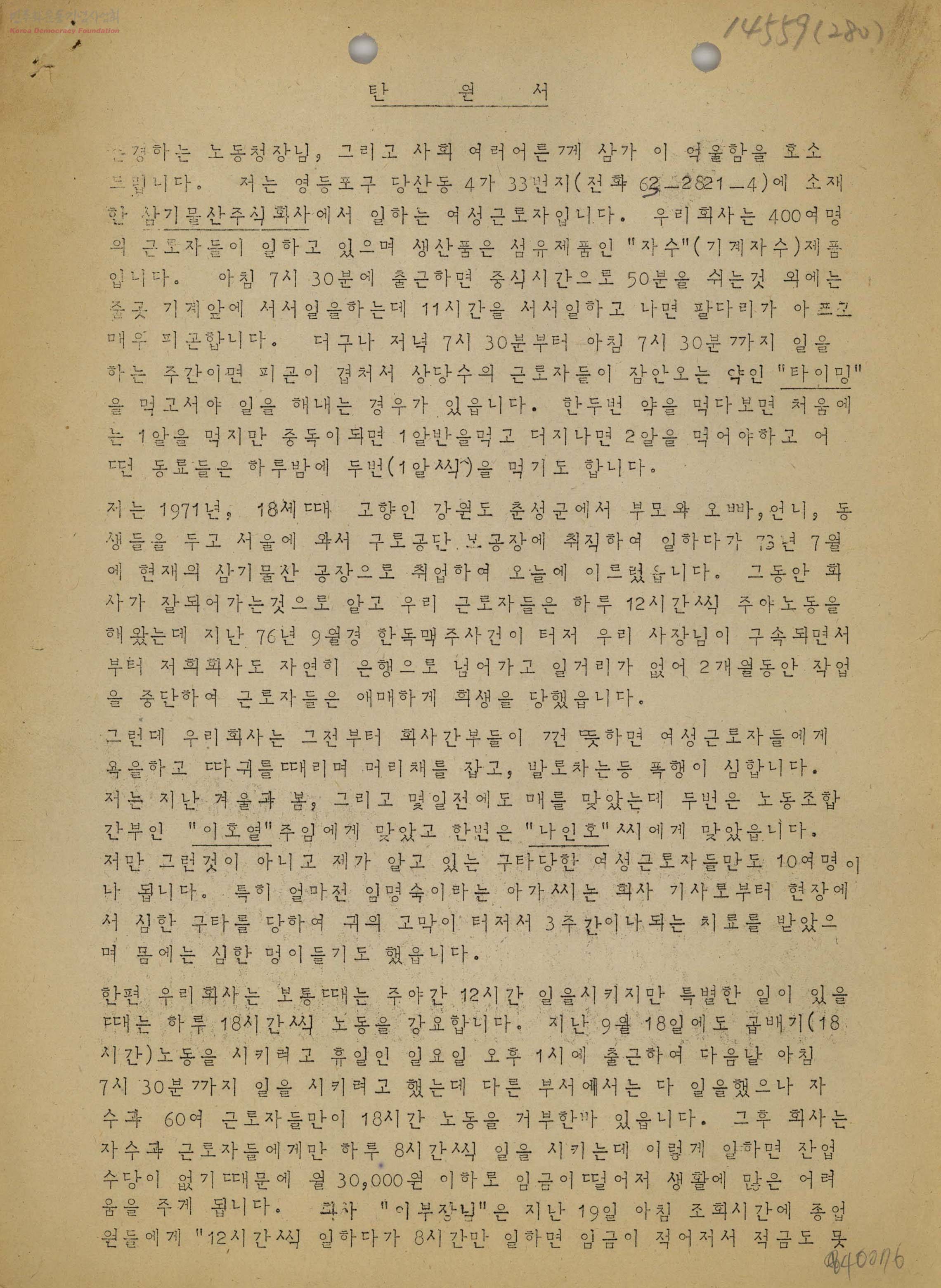 탄원서[삼가물산 여성근로자-무조건 제자리에서 일할 수 있도록 해주십시요.]
