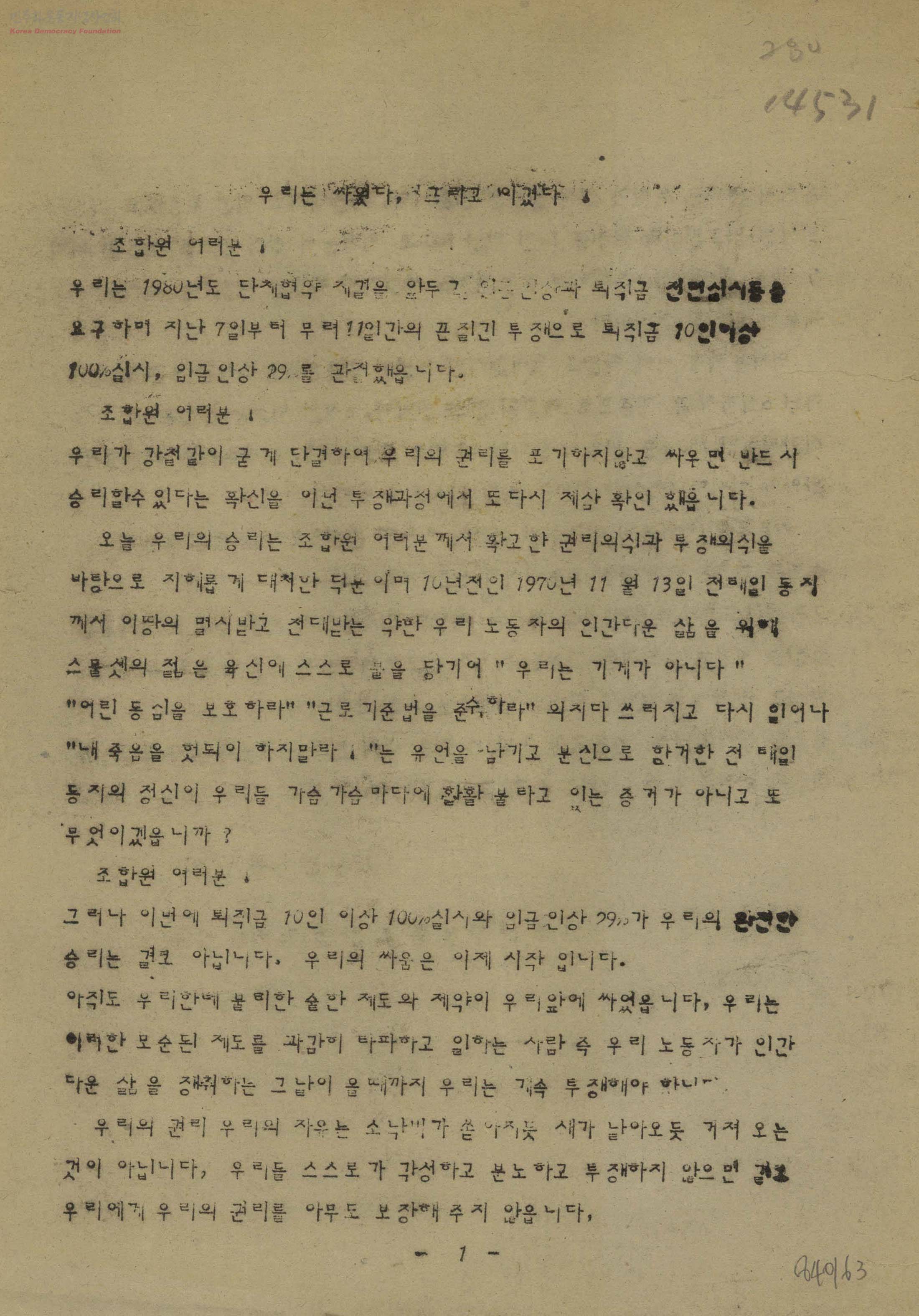- 우리들 스스로가 각성하고 분노하고 투쟁하지 않으면 결코 우리에게 우리의 권리는 아무도 보장해 주지 않는다는 내용.
