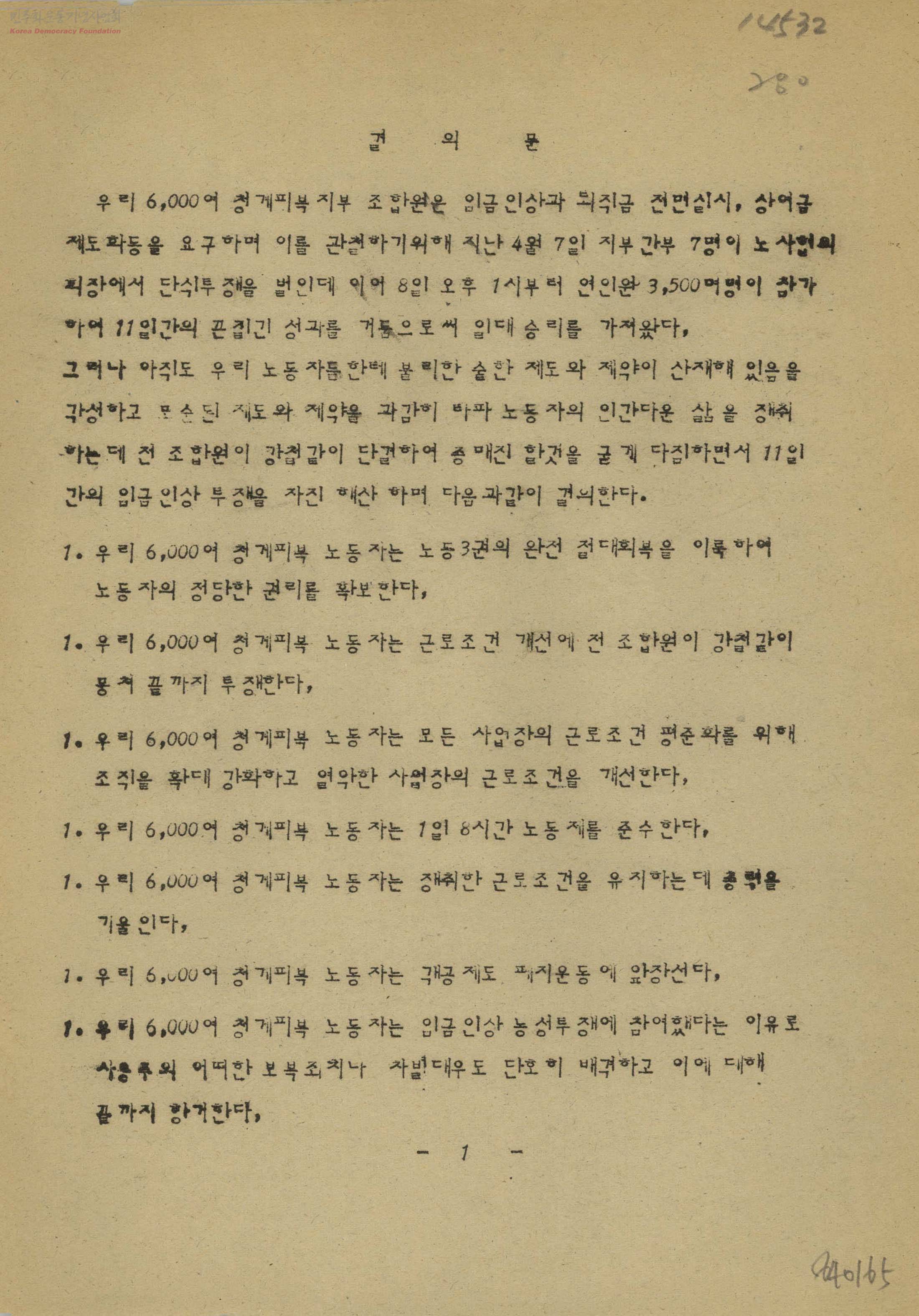 결의문[우리 6,000여 청계피복 노동자는 노동3권의 완전 절대회복을 이룩하여 노동자의 정당한 권리를 확보한다]