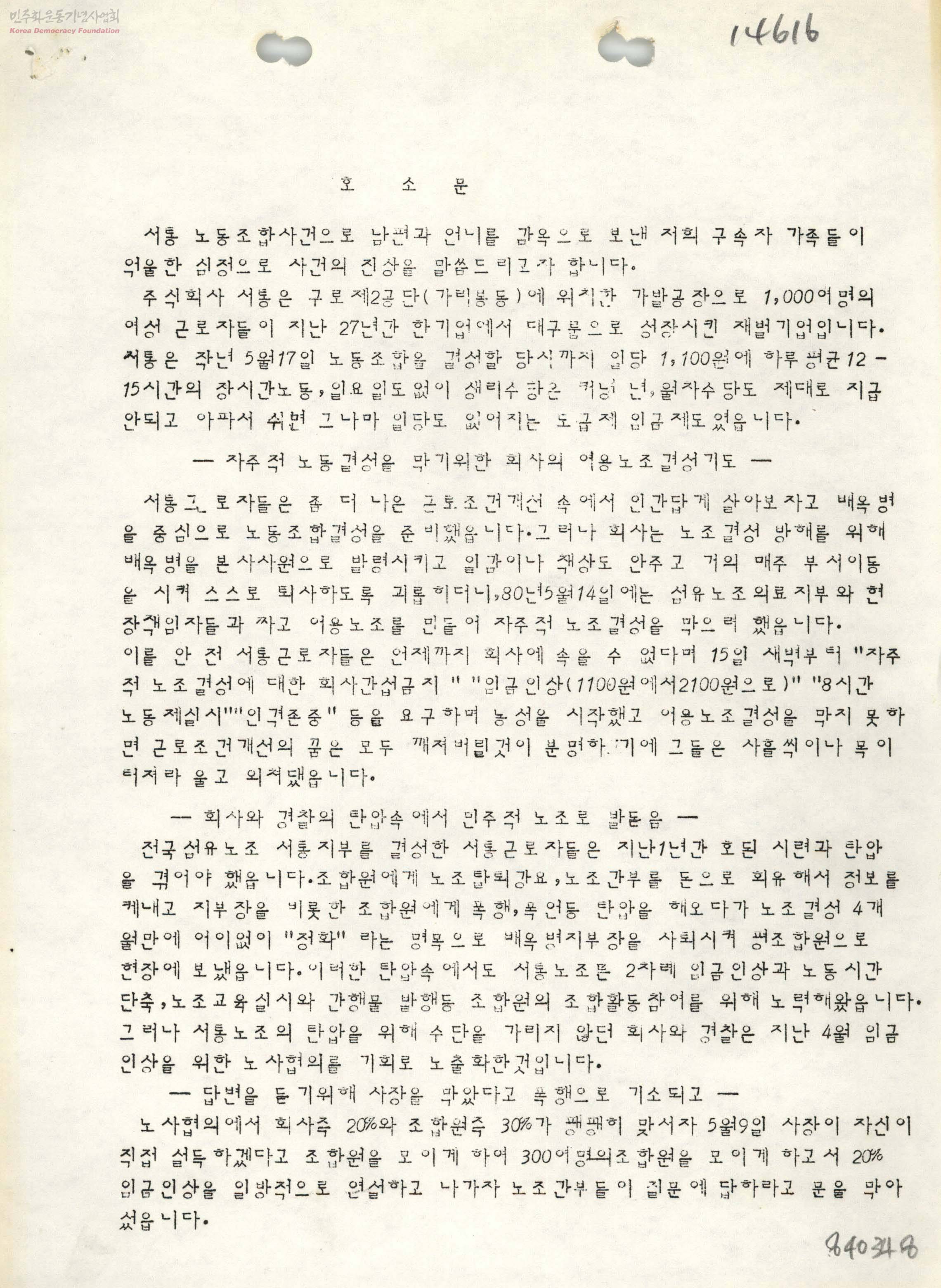 호소문[서통노동조합사건]