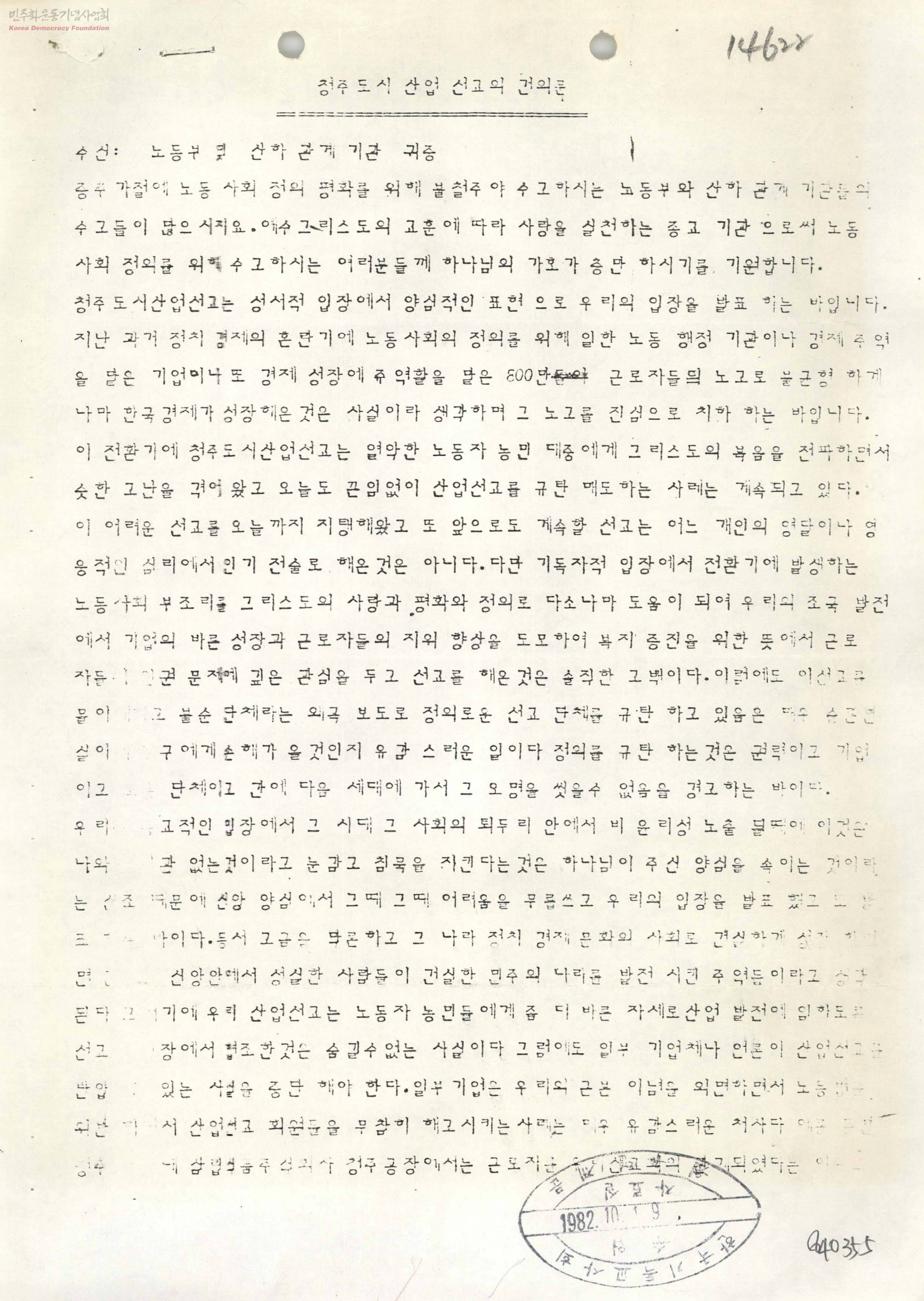 - 노동사회 정의를 위해 노력하는 노동부와 그 산하 관계 기관들은 정의로운 눈초리로 근로자들의 정당한 요구에 대변하기를 바란다 등 청주사건에 관한 입장 표방.