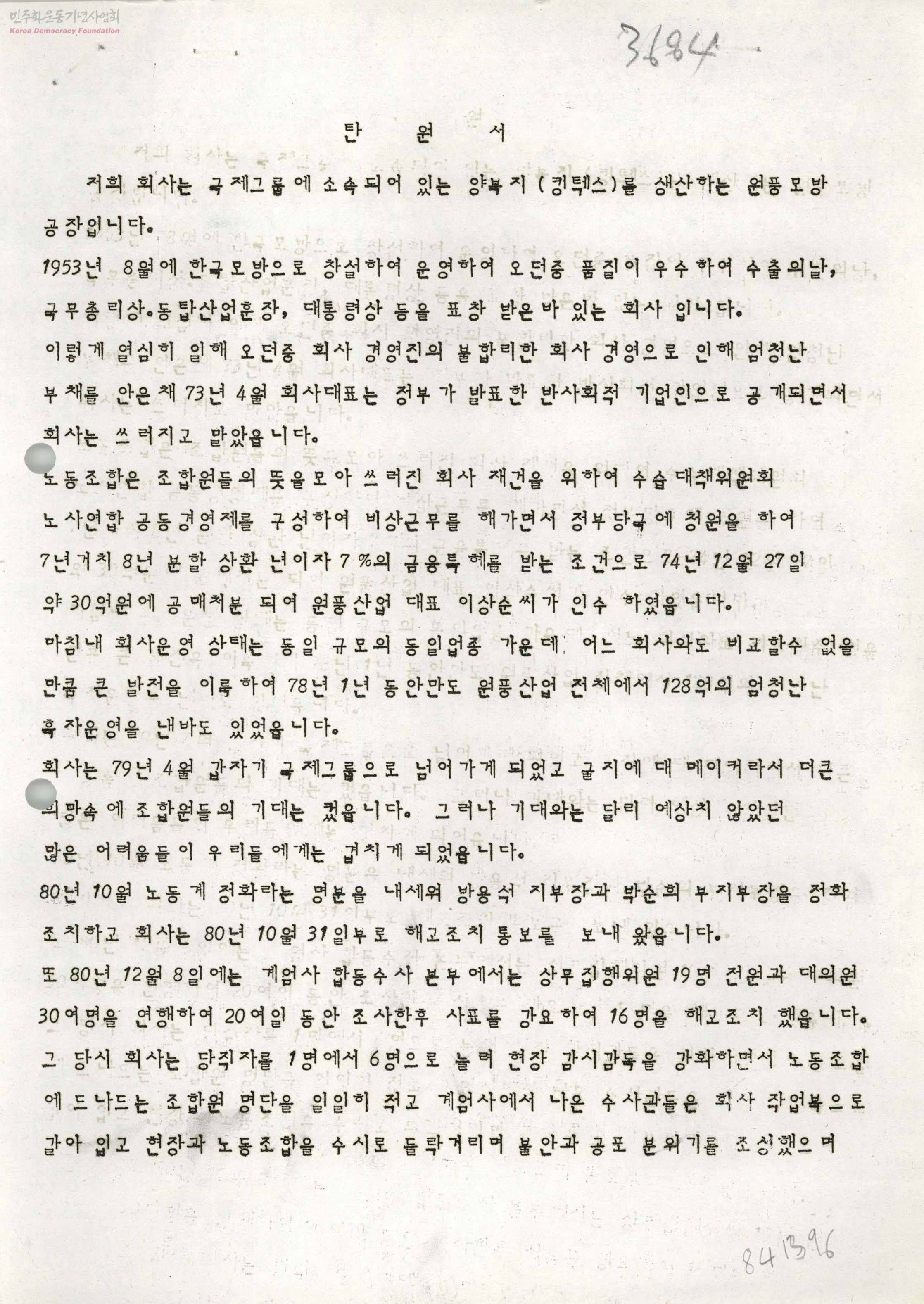 - 국제그룹소속 원풍모방 공장에서의 부당한 해고조치에 대한 항의와 경영정상화 요구