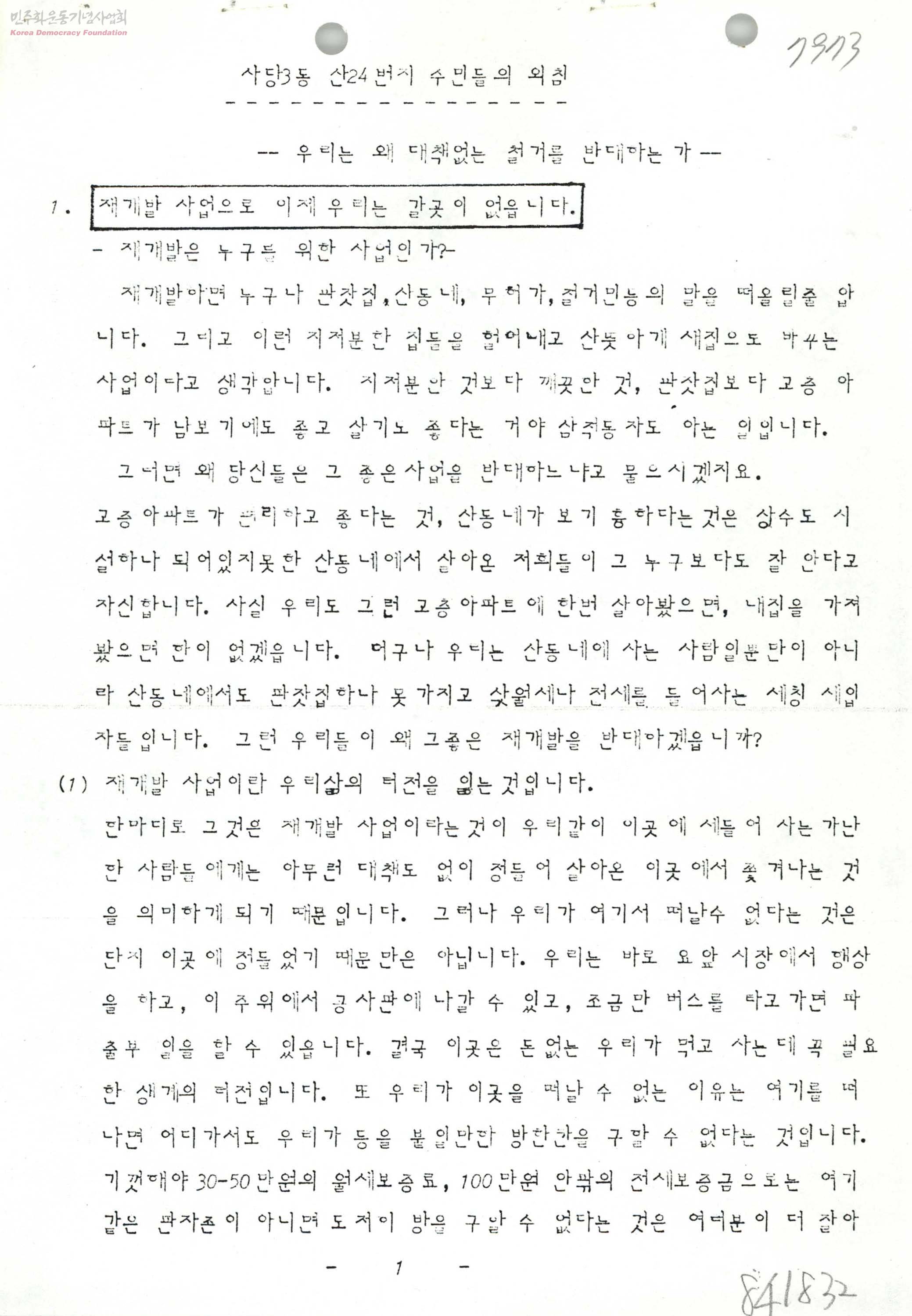 사당3동 산24번지 주민들의 외침-우리는 왜 대책없는 철거를 반대하는가