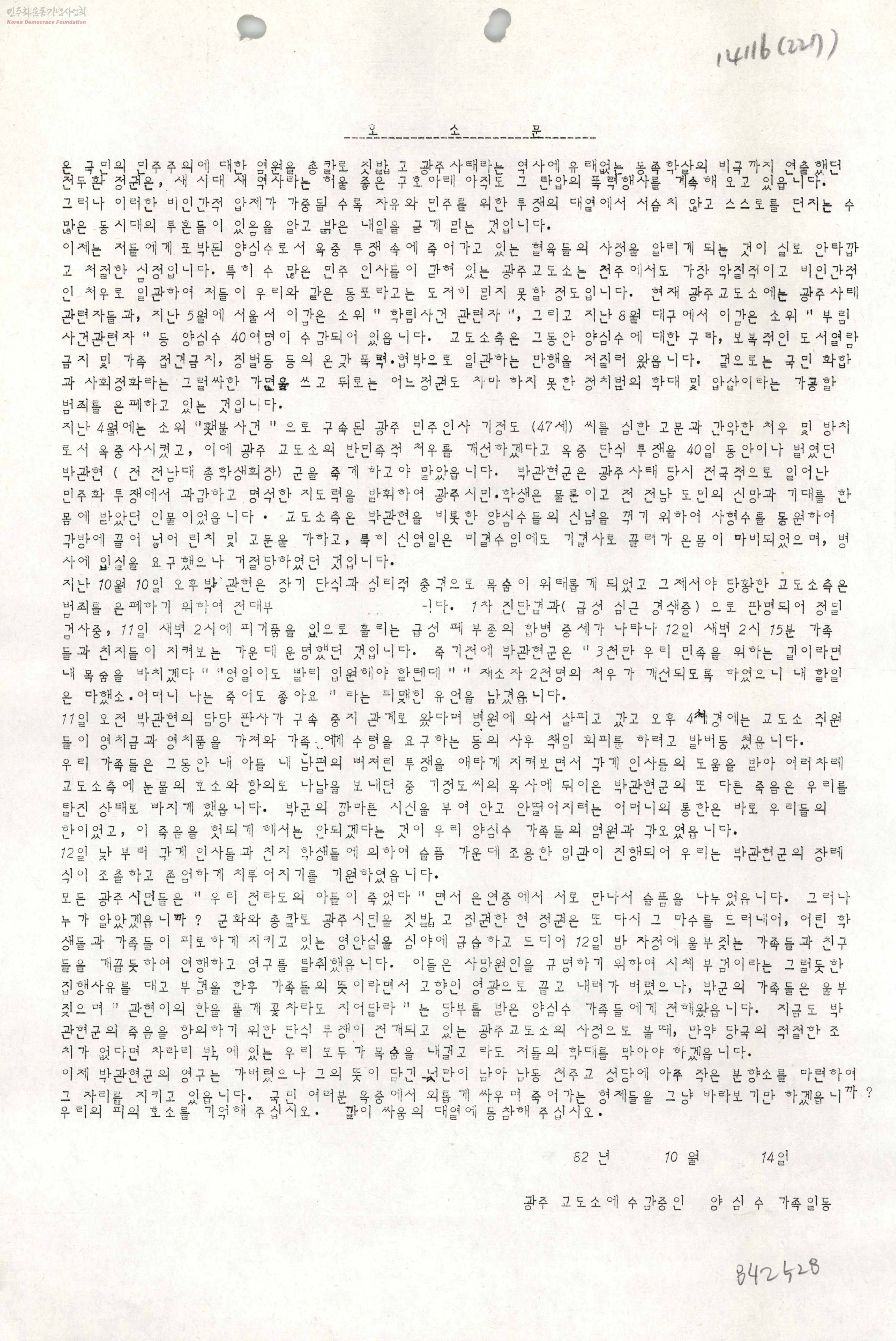 - 광주교도소에서 벌어진 박관현 단식투쟁 사망사건과 관련한 호소문
