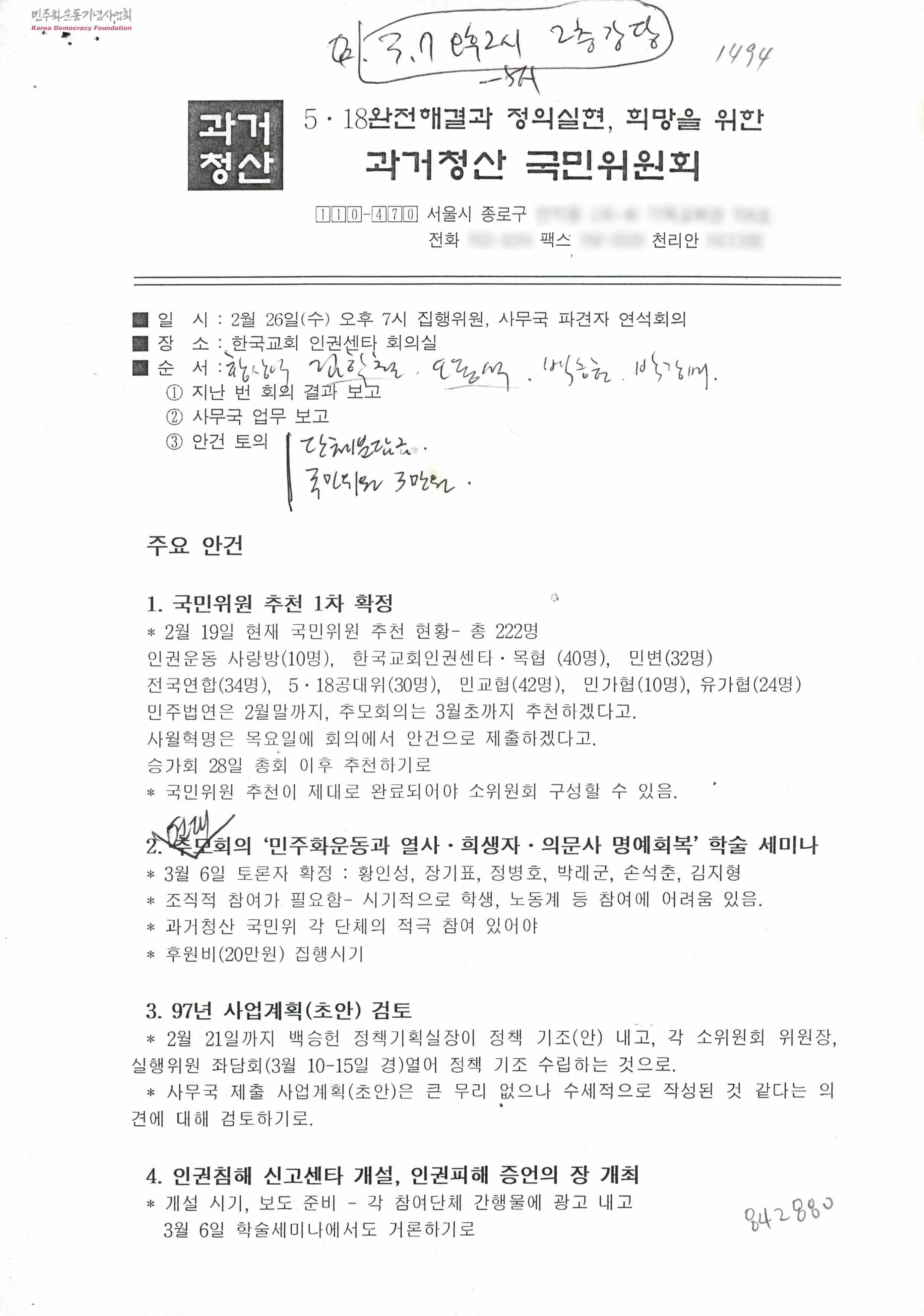 - 과거청산국민위 집행위원, 사무국 파견자 연석회의 민주화운동과 열사, 희생자, 의문사 명예회복 학술세미나 과거청산 국민위 좌담회 기획(안)