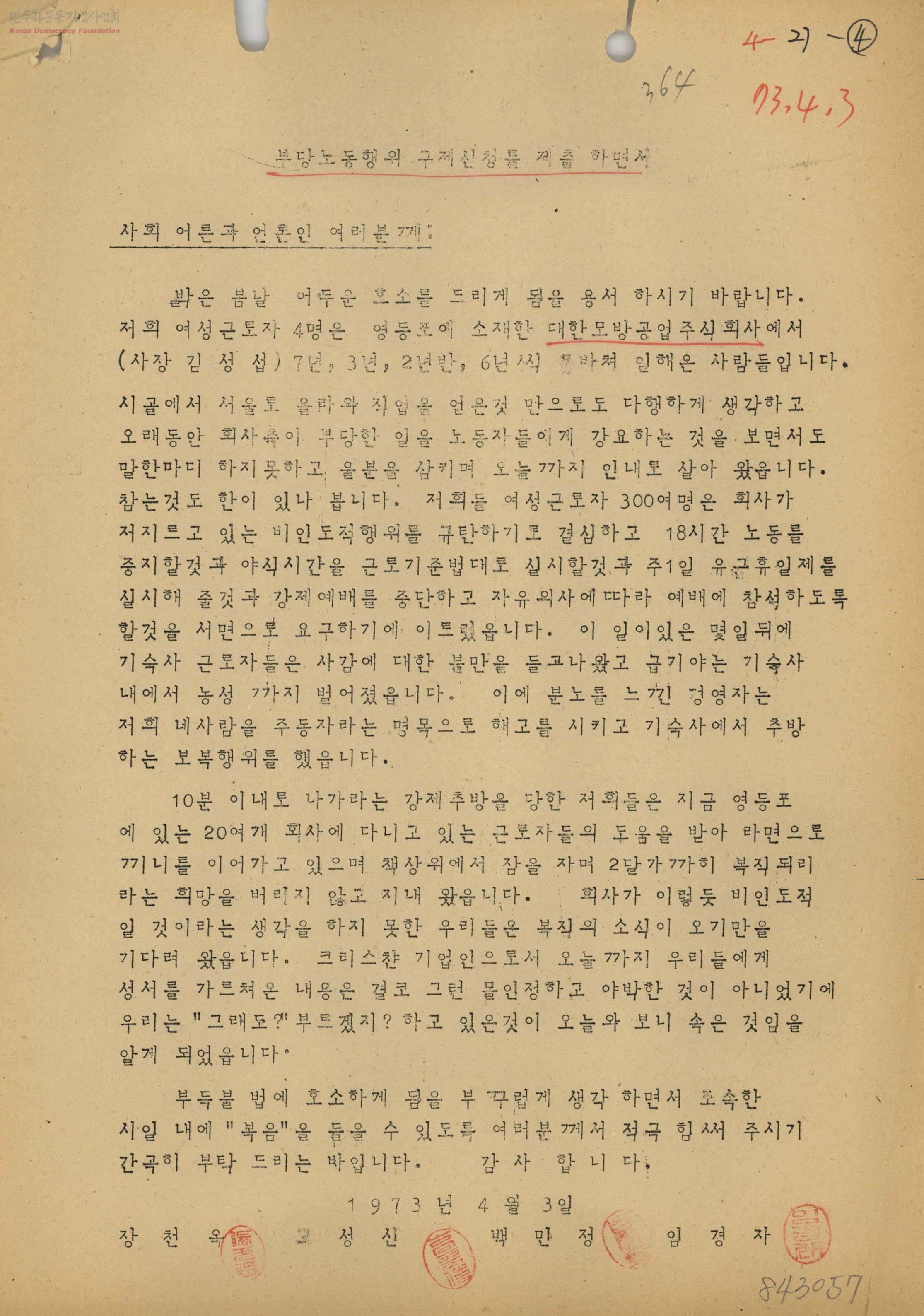 - 대한모방공업 노동자들이 회사의 부당노동행위 구제신청을 하면서 각계의 도움을 요청하는 내용