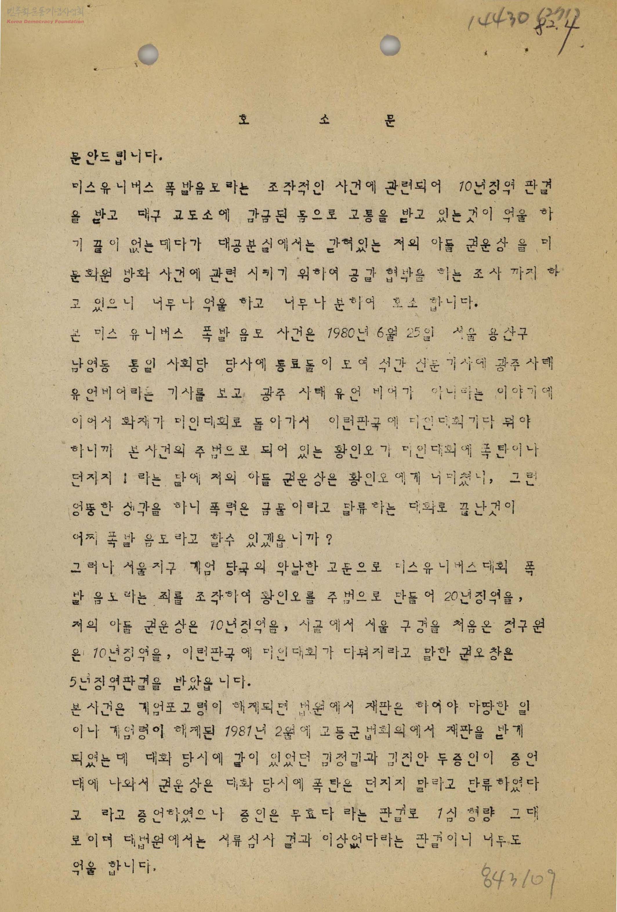 - 미스유니버스 폭발음모 사건 조작으로 구속된 권운상의 석방을 그의 어머니인 조연행이 호소한 글.
