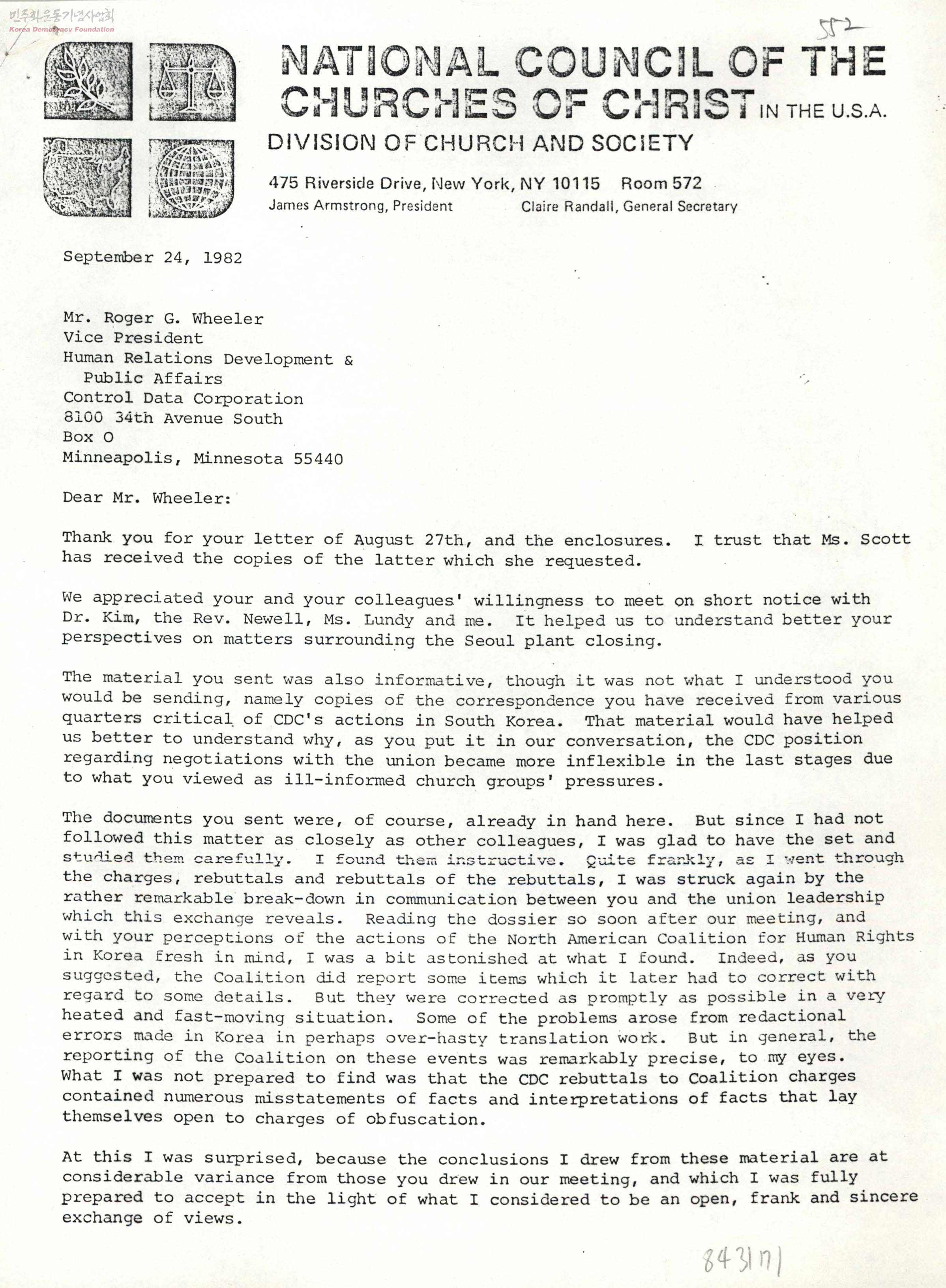 - 미국 National Council of the Churches of Christ의 교회와사회담당부서의 Dwain C.Epps가 콘트롤데이타의 파업과 노조투쟁에 관하여 전하는 글