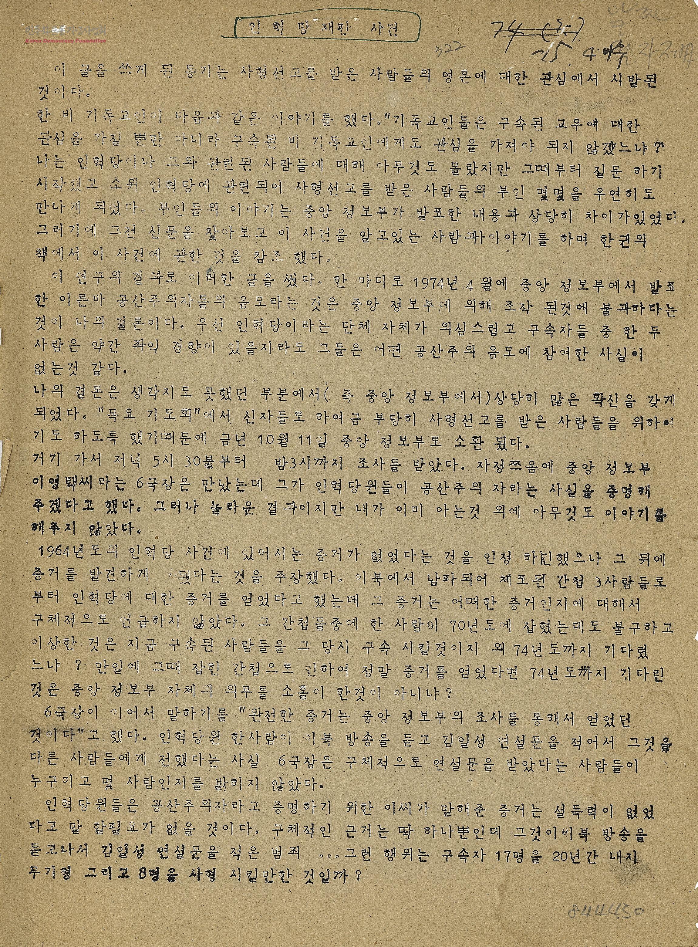 - 인혁당 사건으로 사형선고를 받은 사람들의 몇몇 부인과의 대화와 신문, 책을 참고로 인혁당 재판 사건 관련 의혹 제기