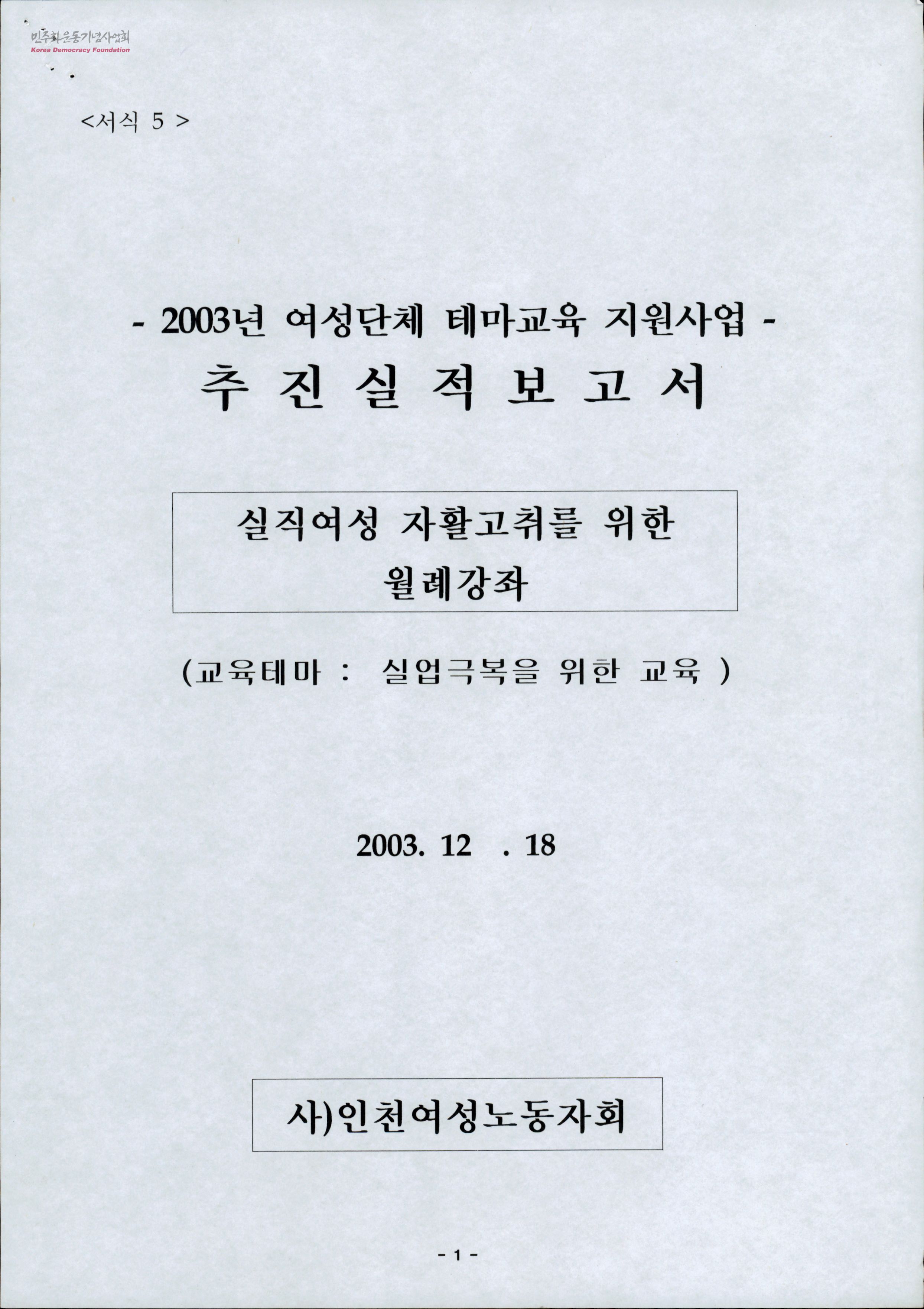 2003년 여성단체 테마교육 지원사업 추진실적보고서-실직여성 자활고취를 위한 월례강좌