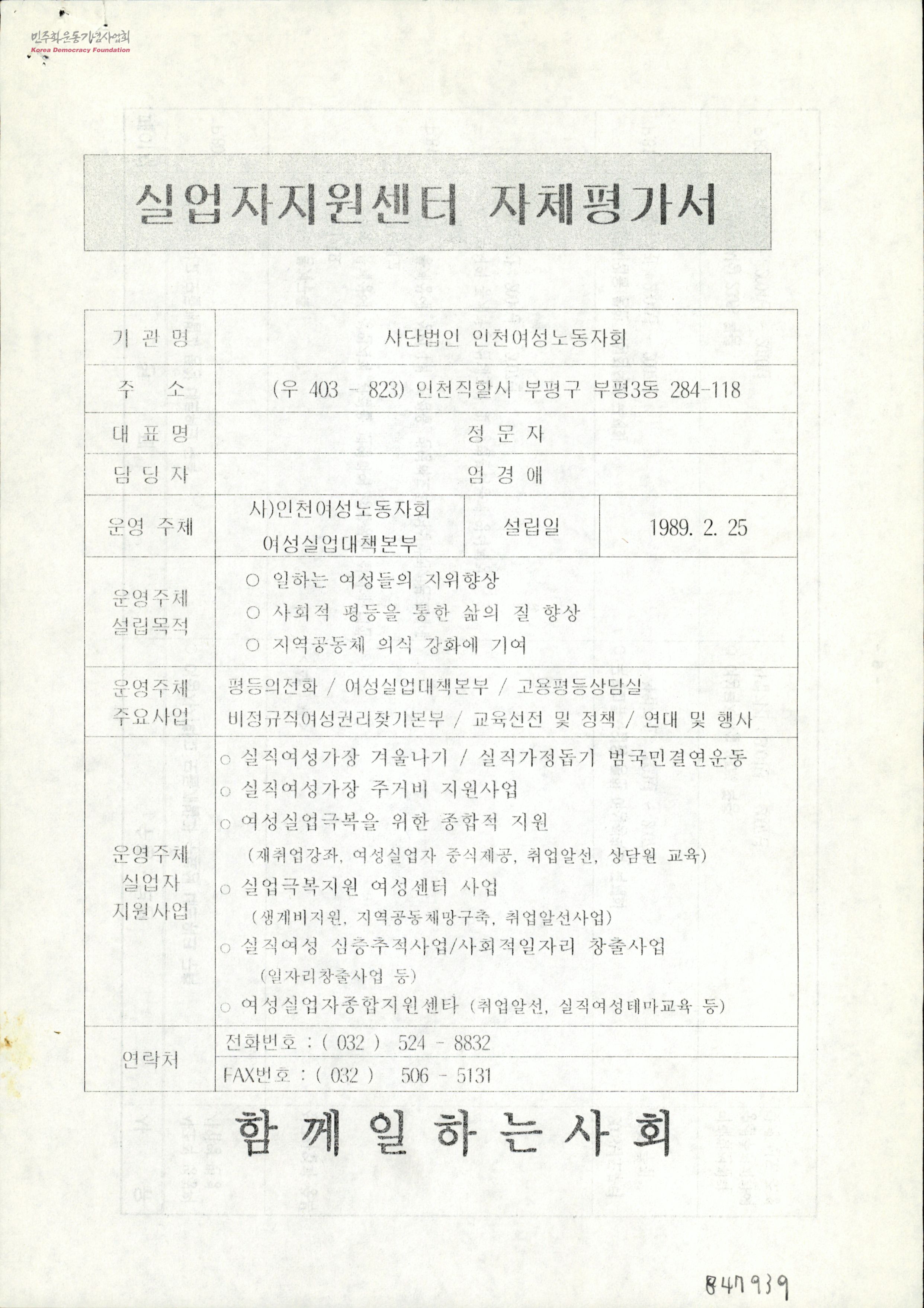 - 사단법인 인천여성노동자회의 지역현황 활동 예산 등의 세부항목 평가