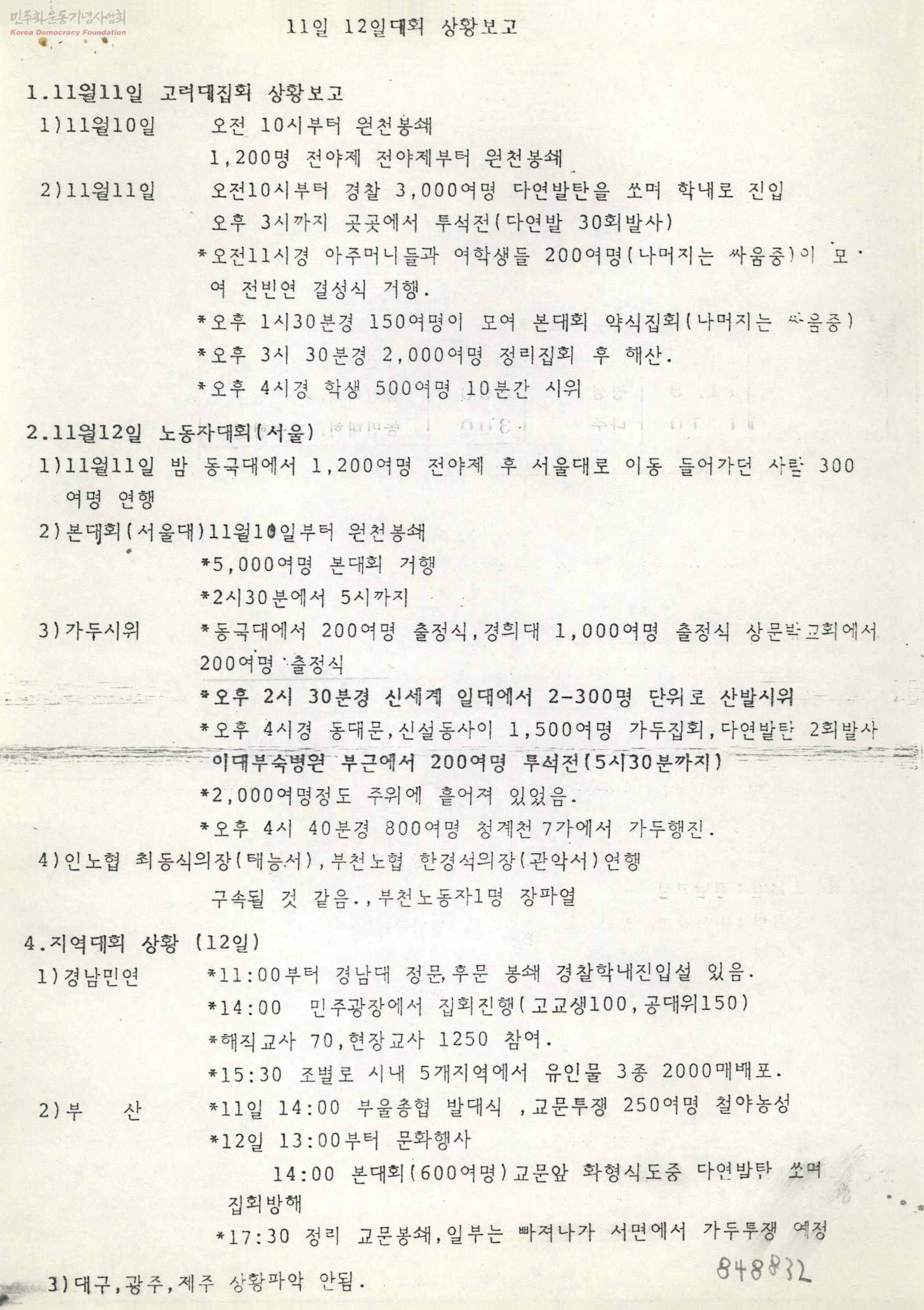 - 반독재 민주화와 자유평등 사회 실현을 위해 반파쇼민주화운동, 주한미군 철수, 국가보안법 철폐 운동 등을 전개한 전국민족민주운동연합의 자료로 전국민족민주운동연합의11일 12일대회 상황보고 자료이다.