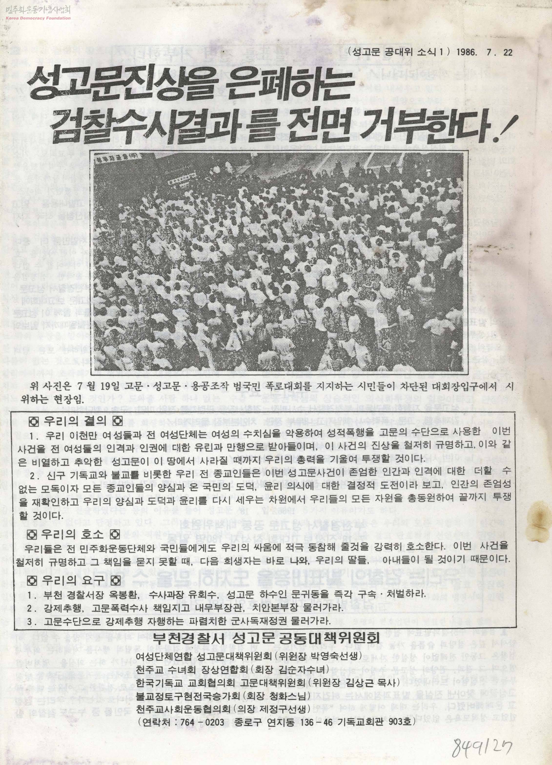 성고문 공대위 소식 1986년 7월 22일 제1호-성고문진상을 은폐하는 검찰수사결과를 전면 거부한다!