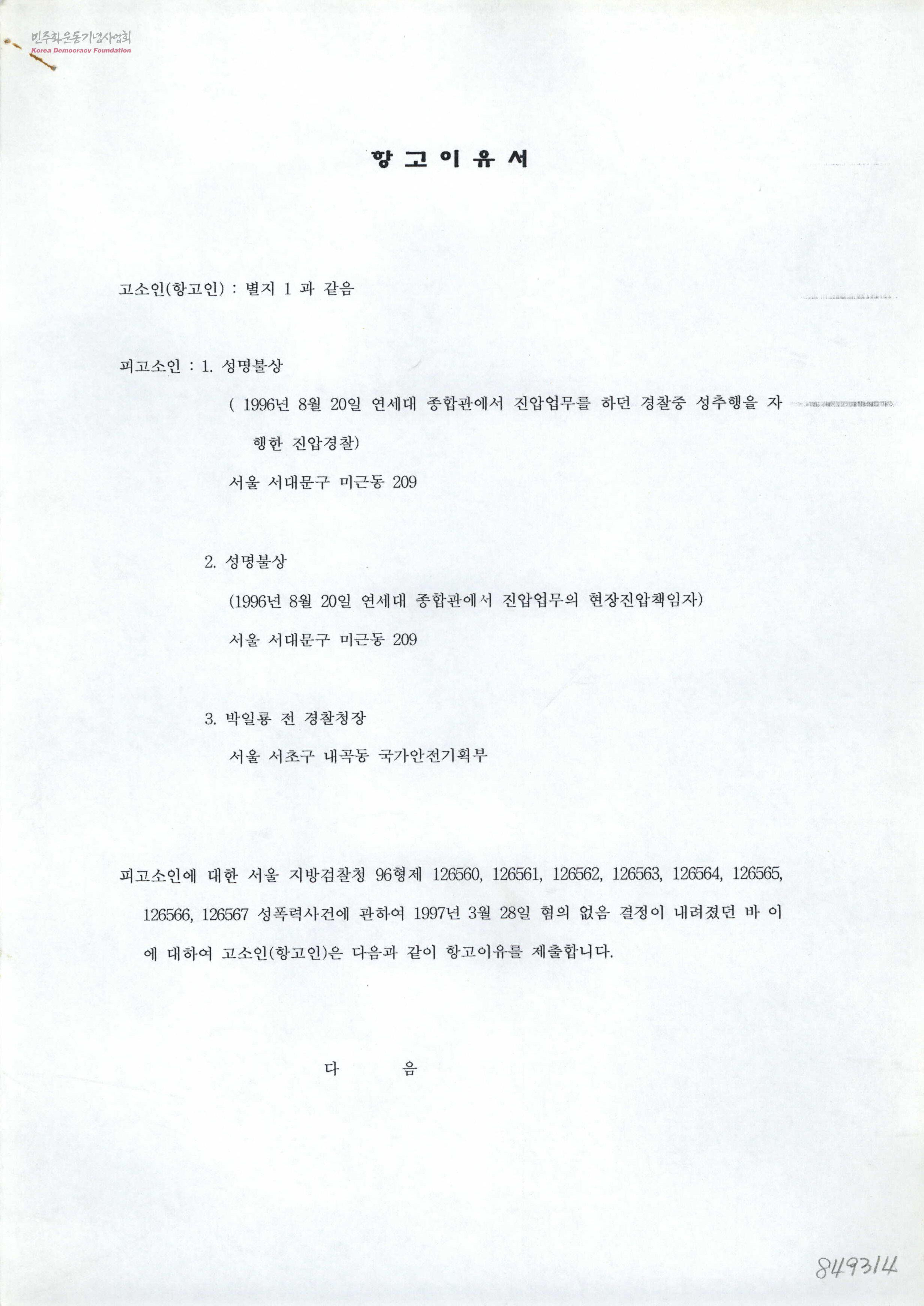 - 피고소인 : 1996년 8월 20일 연세대 종합관에서 진압업무를 하던 경찰 중 성추행을 자행한 진압경찰, 진압업무 현장책임자, 박일룡 전 경찰청장 피고소인에 대한 성폭력 사건에 관하여 혐의 없음 결정이 내려진 바 이에 대하여 고소인이 항고이유를 제출.