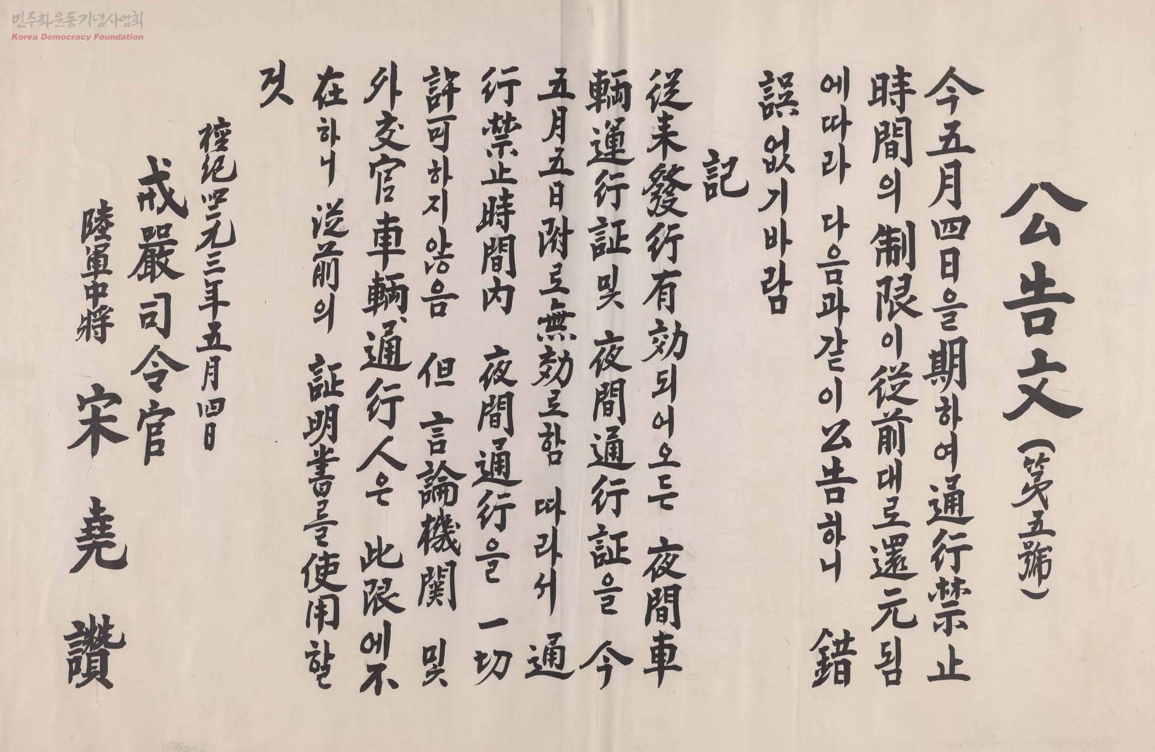 - 1960년 이승만정권의 독재와 무능에 항거한 4.19 민주화 운동 관련. 야간통행금지 제한에 대한 공고