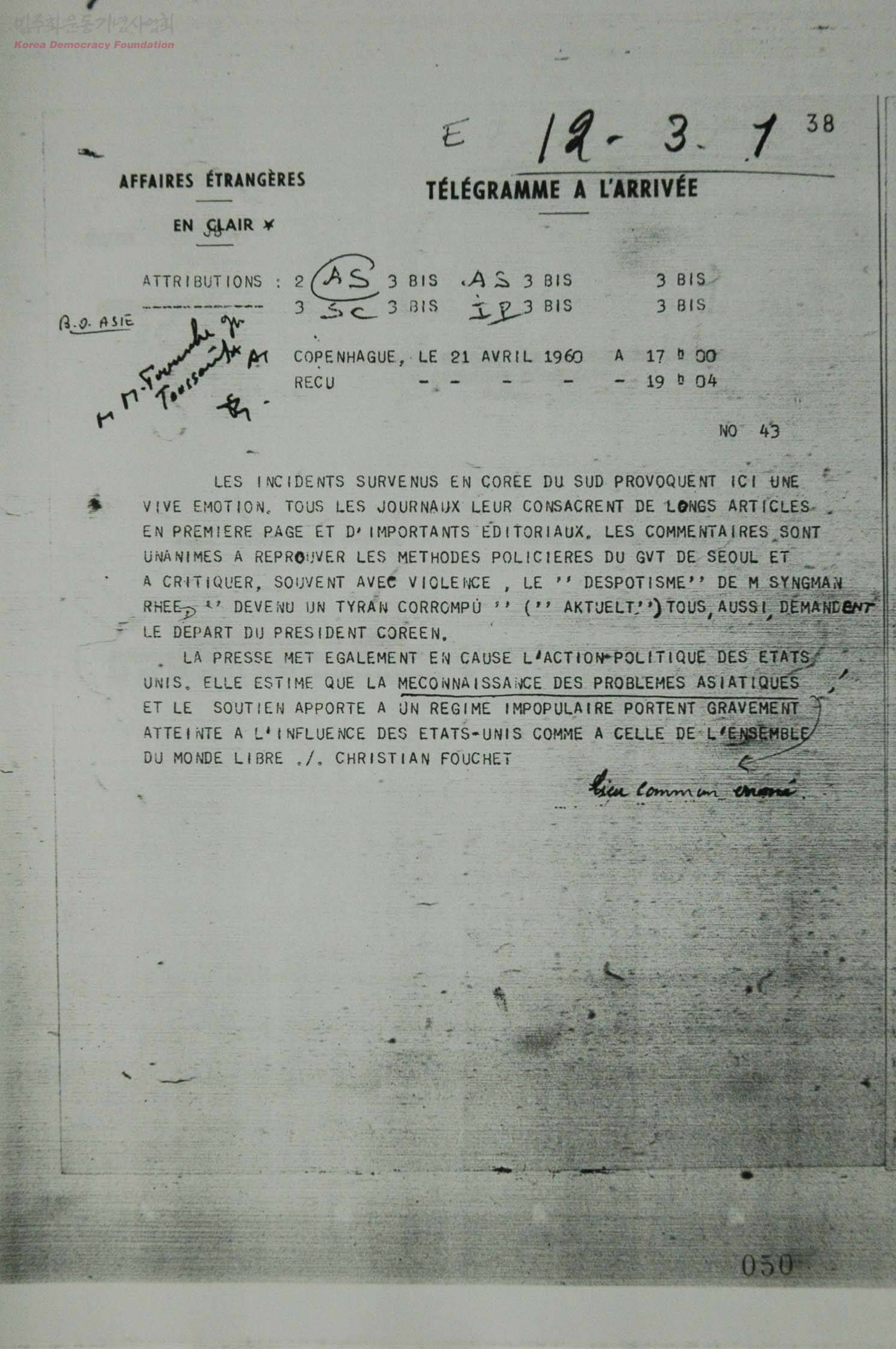- 덴마크 모든 신문이 한국 상황에 대해 자세히 보도하고 있음. 덴마크 신문들은 만장일치로 서울의 강압적 경찰과 이승만의 전제적 통치를 비판. 이승만의 하야를 요구. 미국이 민중의 지지를 잃은 정권을 지지한다면 이는 자유진영 전체에 대한 미국의 영향력을 심각하게 감소시킬 것이라고 강조.