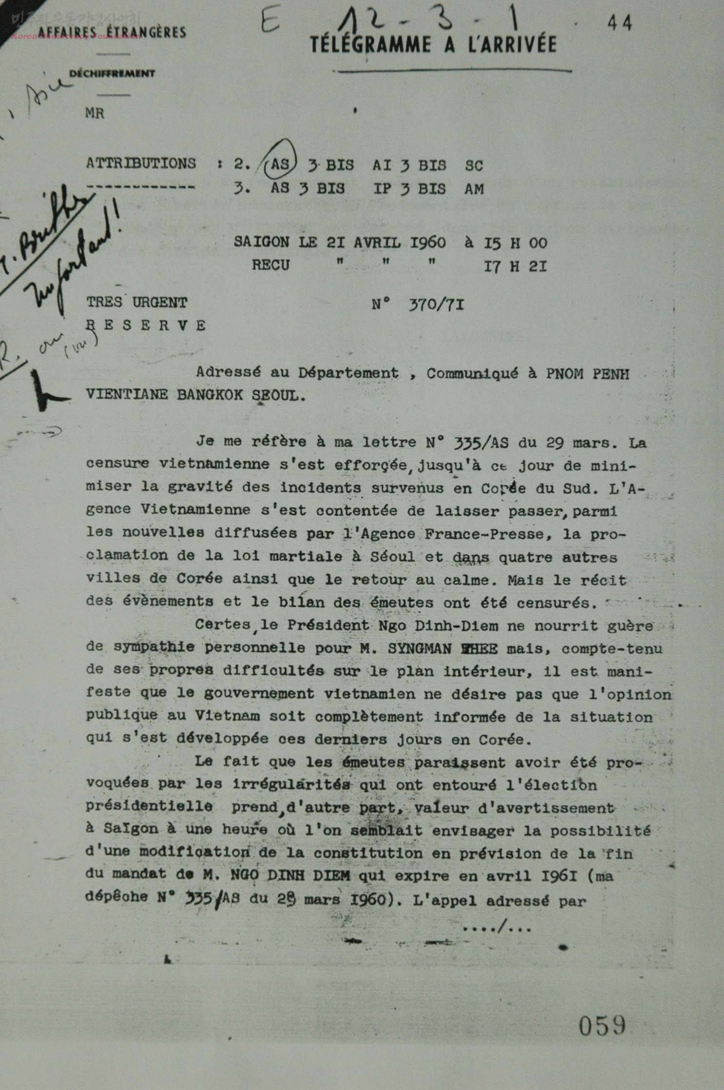 - 남베트남이 한국 관련 보도에 언론검열을 하고 있음. 프랑스 통신사 AFP의 기사를 받은 베트남 통신사의 기사에서 계엄령으로 한국의 상황이 안정되었다는 소식만 허용되고 4월19일 봉기 사상자에 대한 소식은 사라졌음. 남베트남의 응오딘지엠(Ngô Ðình Diệm) 정부가 한국의 상황에 대한 완전한 정보를 베트남인들이 아는 것을 원하지 않고 있음.