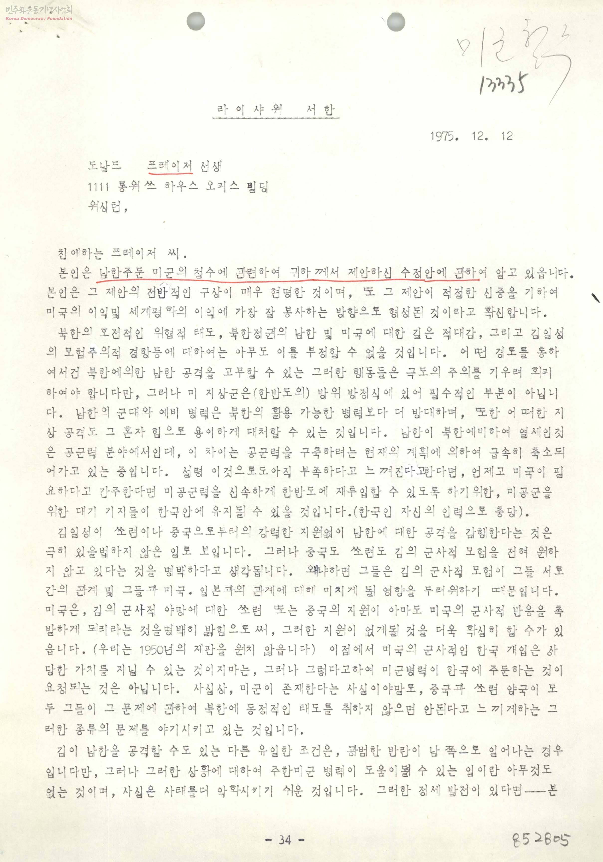 - 프레이저 하원 의원이 상정한 주한미군철수안을 지지한다는 내용의 하버드 대학 교수 에드윈 라이샤워의 서신