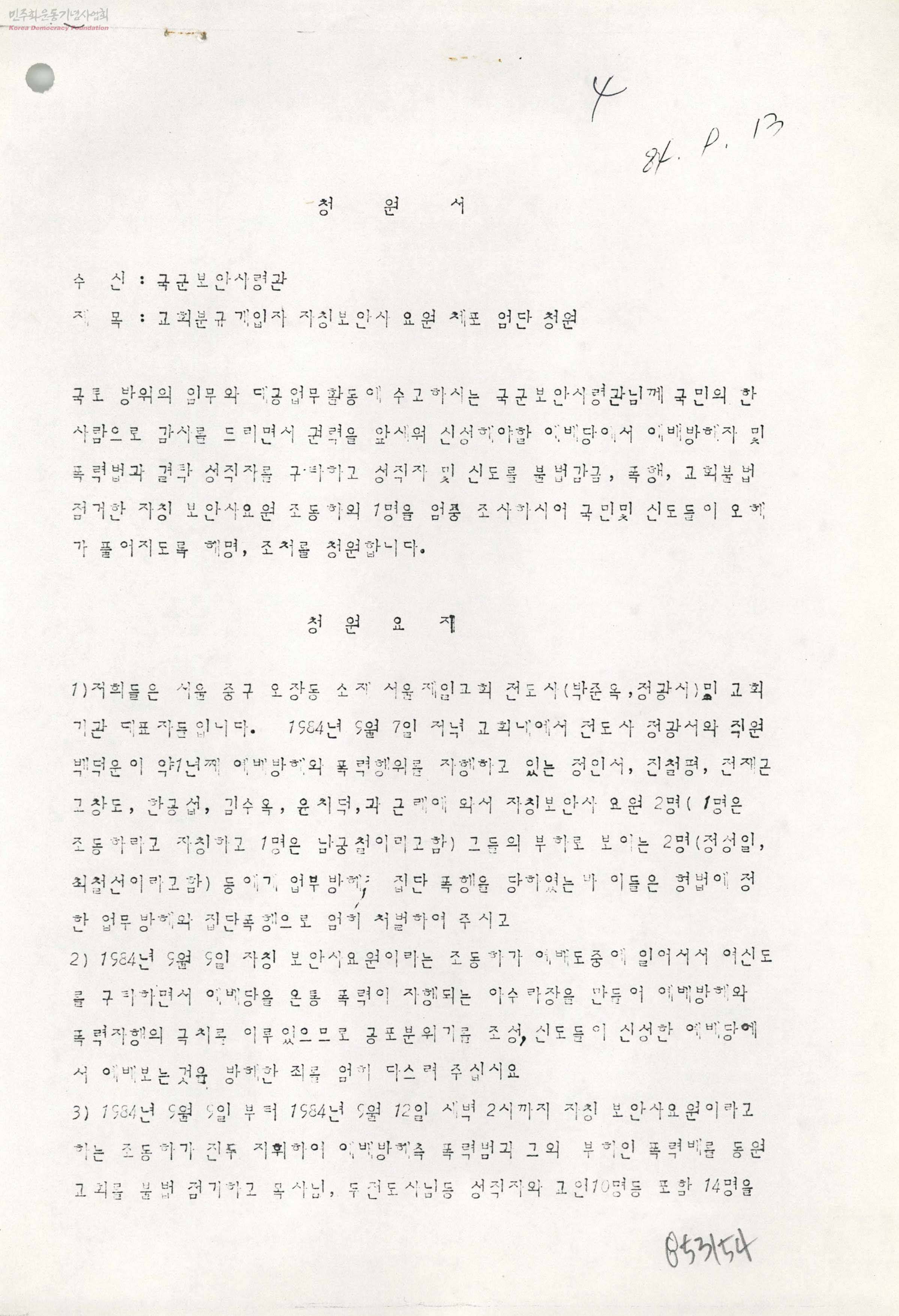 청원서-교회분규 개입자 자칭보안사 요원 체포 엄단 청원[수신:국군보안사령관]