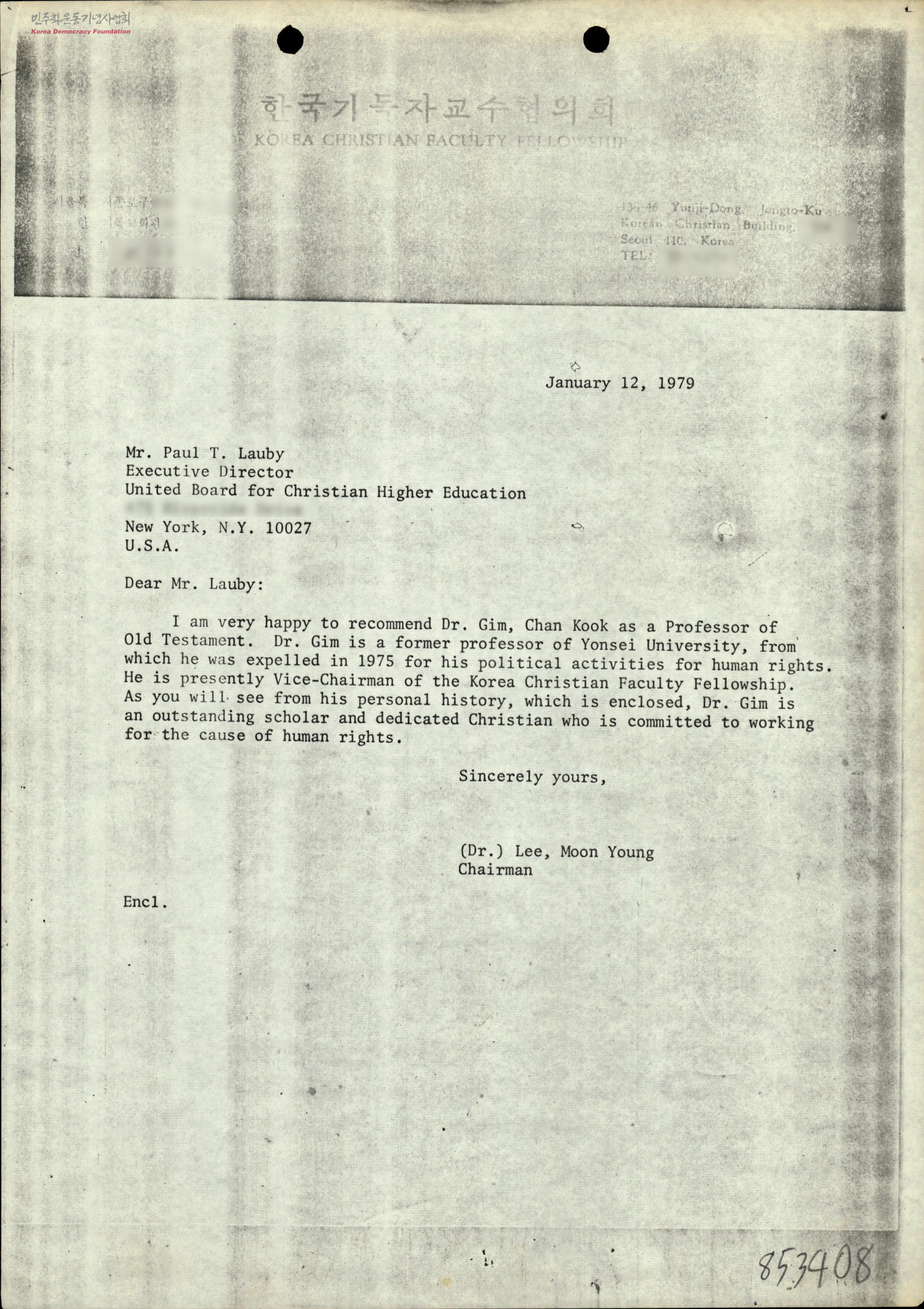 - 정부의 독재를 반대하고 민주주의를 요구하는 활동을 해온 한국기독자교수협의회 이문영이 United Board for Christian Higher Education의 Paul T. Lauby에게 김찬국 교수와 그의 약력을 소개하는 내용의 공문 첨부 : 김찬국 교수 개인 약력 4장