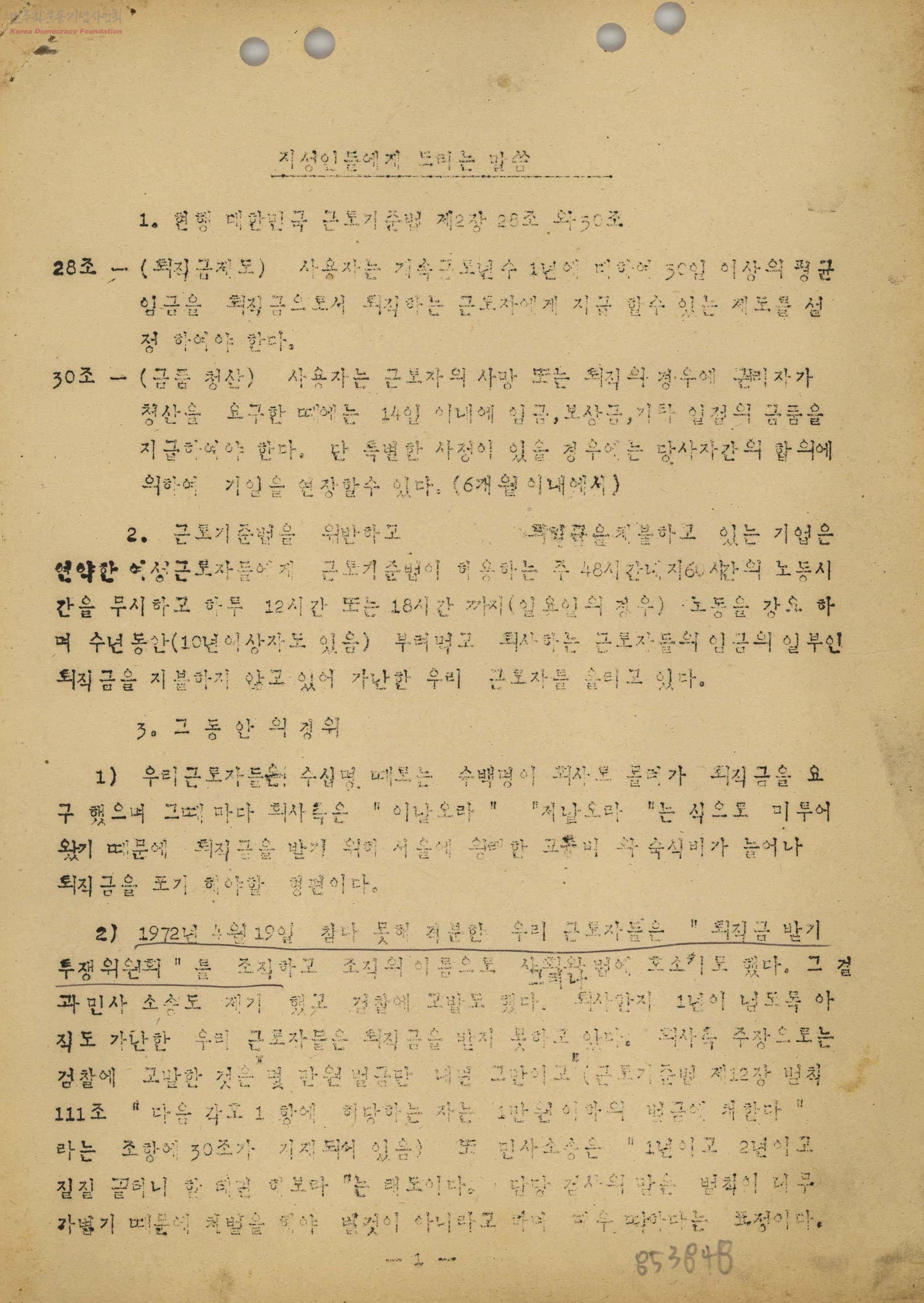 - 1. 현행 대한민국 근로기준법 제2장 28조와 30조 2. 근로기준법을 위반하고 퇴직금을 체벌하고 있는 기업 3. 그동안의 경위 4. 퇴직금을 못받은 사람들과 금액