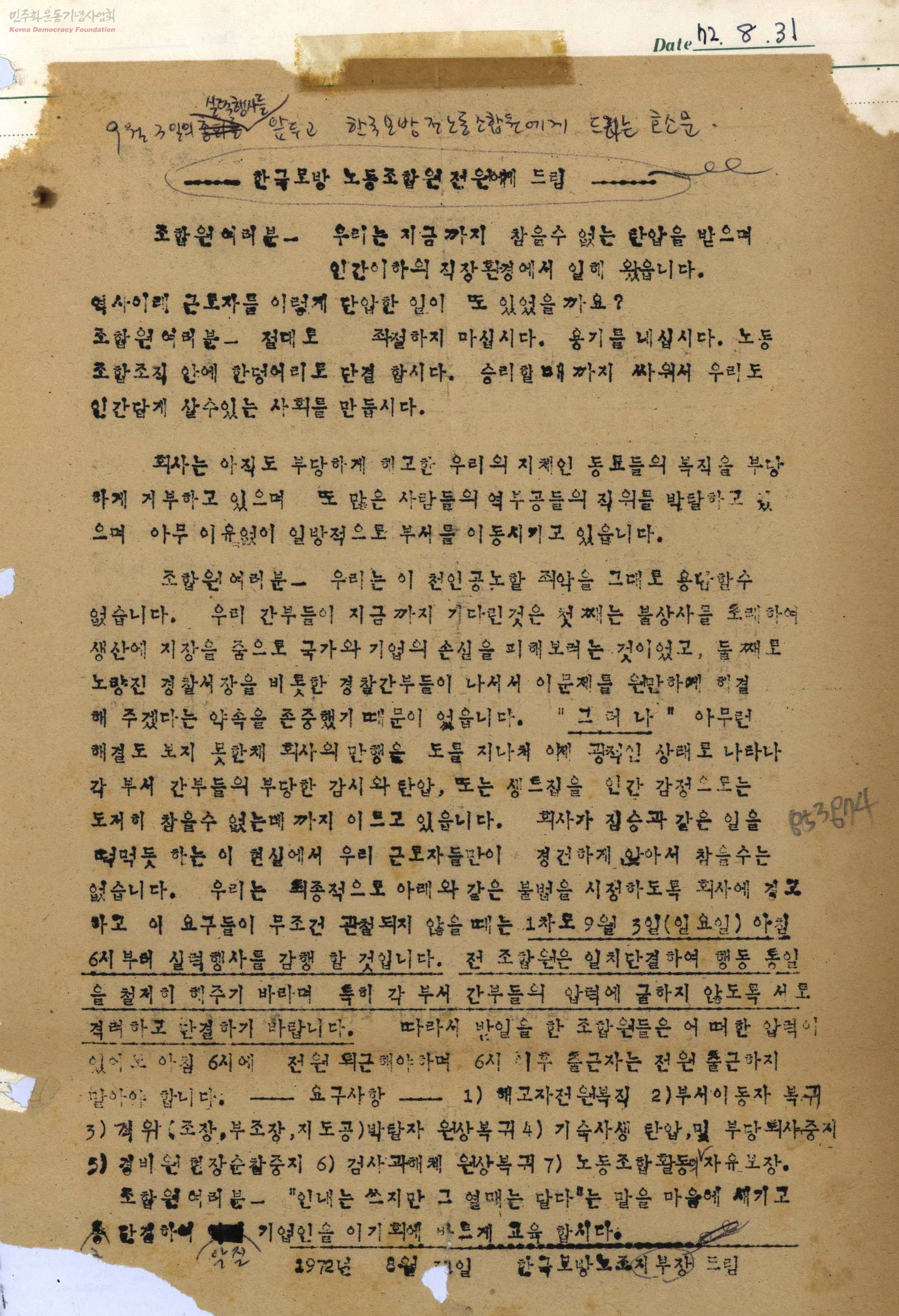 - 회사는 아직도 부당해고한 우리의 동료들의 복직을 거부하고 있으며 많은 역부공들의 직위를 박탈하고 일방적으로 부서를 이동시키고 있다. 이에 우리는 최종적으로 회사에 경고하고 이 요구들이 관철되지 않을 때는 1차로 9월 3일 실력행사를 감행할 것이므로 전 조합원은 일치단결해 주기 바란다.