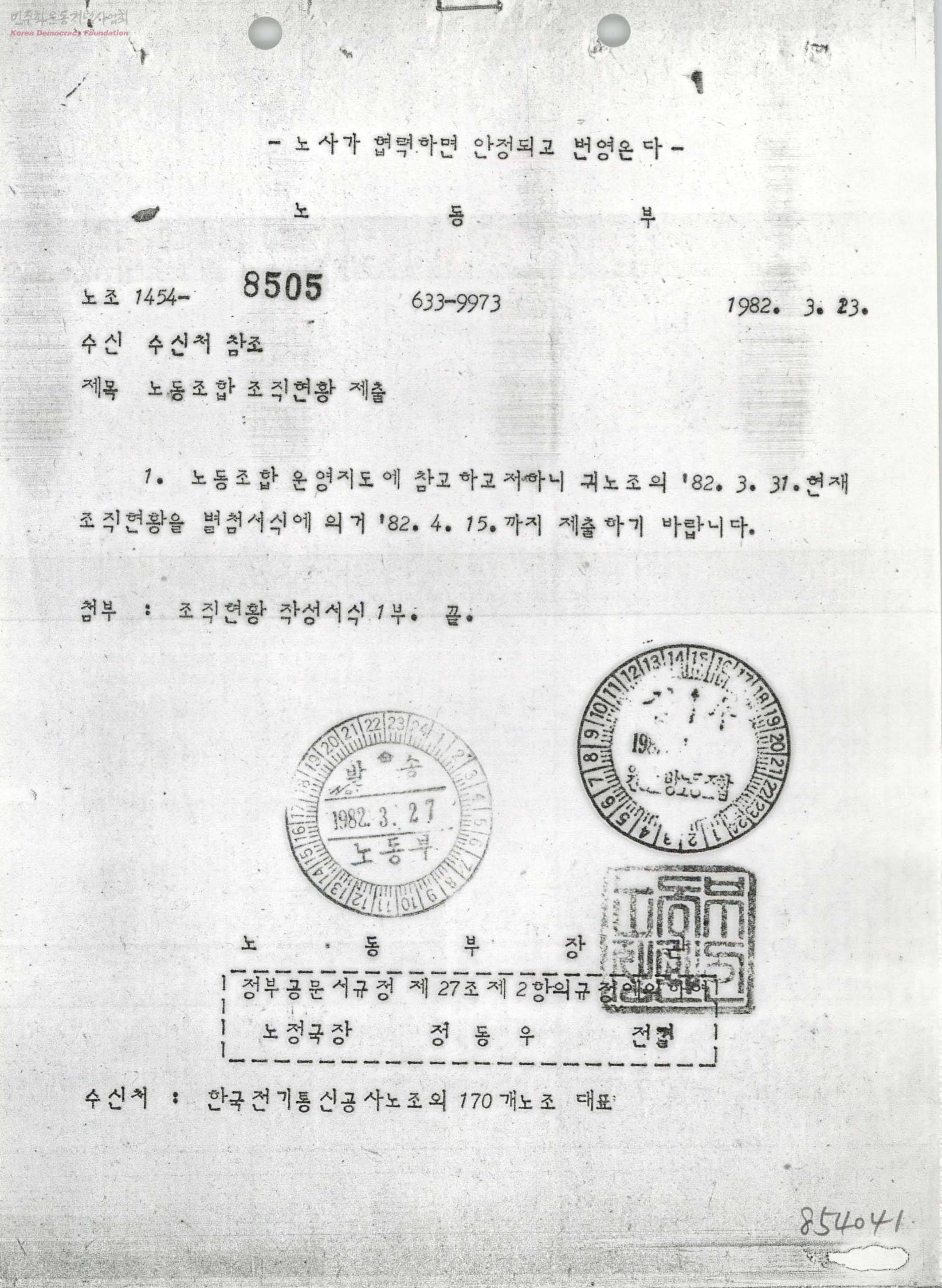 - 노동조합 운영 지도에 참고하기위한 1982년 3월 31일 현재 노직현황을 1982년 4월 15일까지 제출 요청