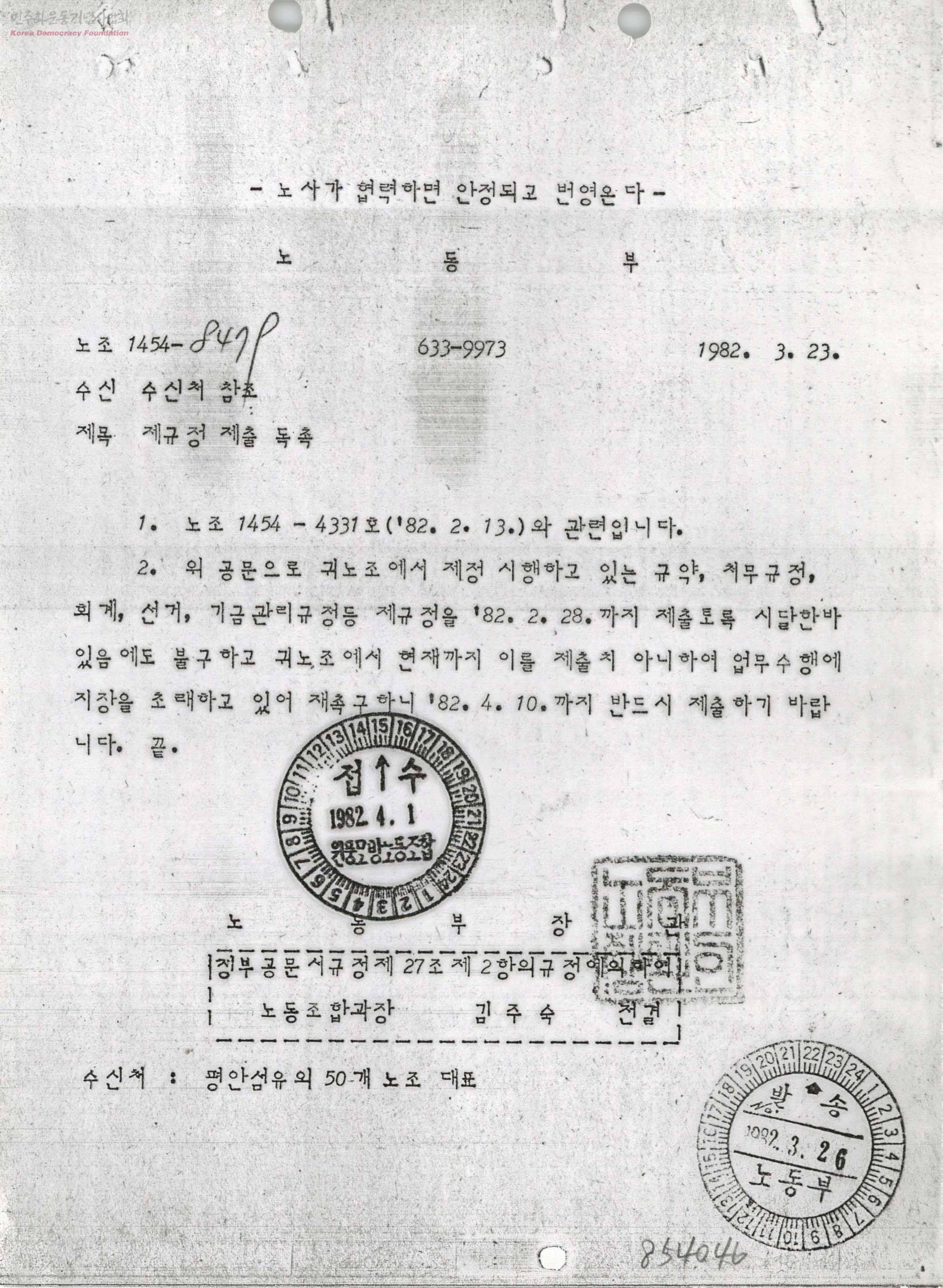 - 노조에서 제정 시행하고 있는 규약, 처무규정, 회계, 선거, 기금관리 규정 등 제규정을 1982년 2월 28일까지 제출토록 시달한 바 있음에도 현재까지 제출하지 않았으므로 1982년 4월 10일까지 제출 바람