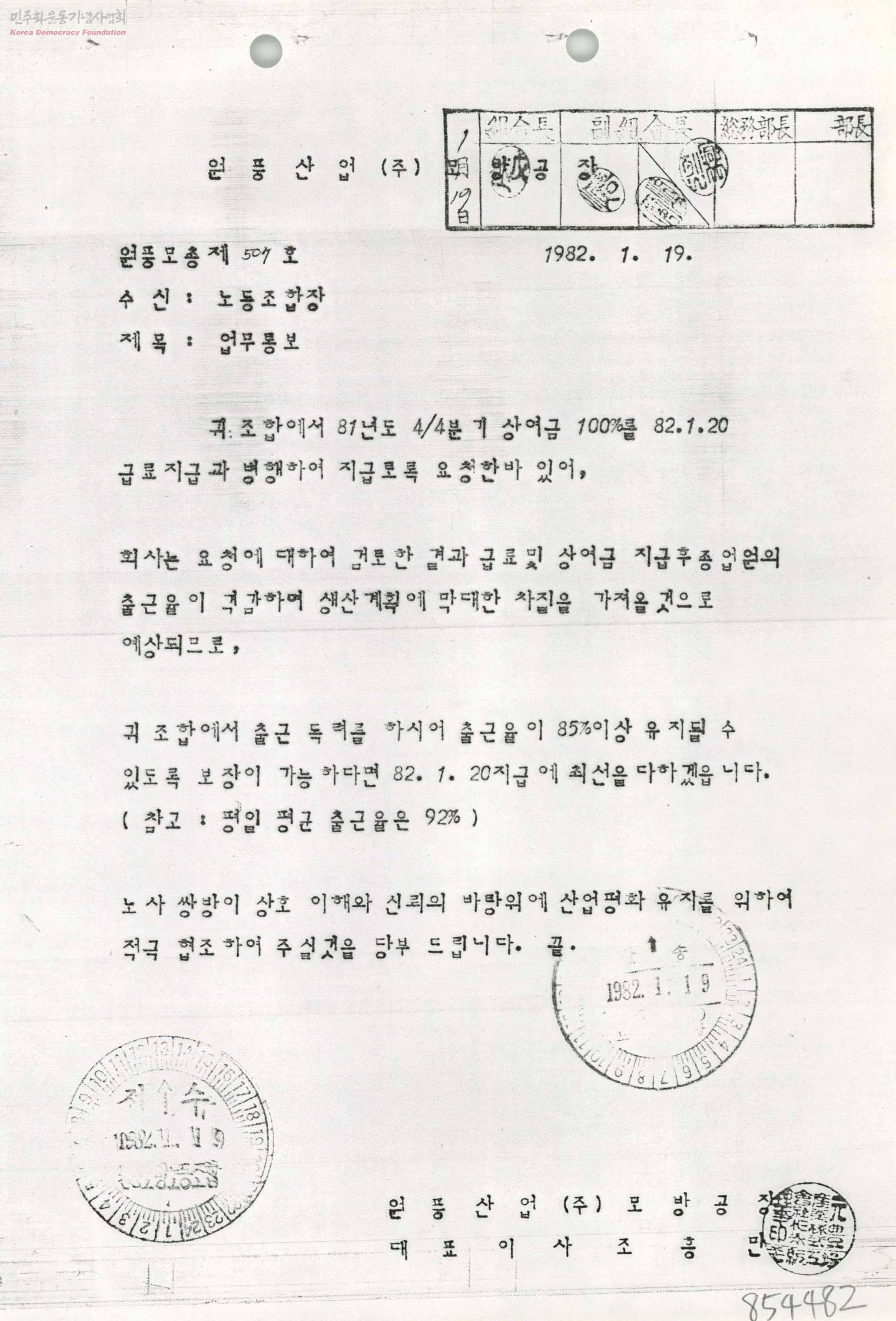 - 노조 측의 81년도 4/4분기 상여금 100% 인상 요구에 대하여, 노조 측이 출근율 85% 이상이 유지될 수 있게 독려한다면 1982년 1월 20일 급료와 함께 상여금을 지급하겠다는 내용