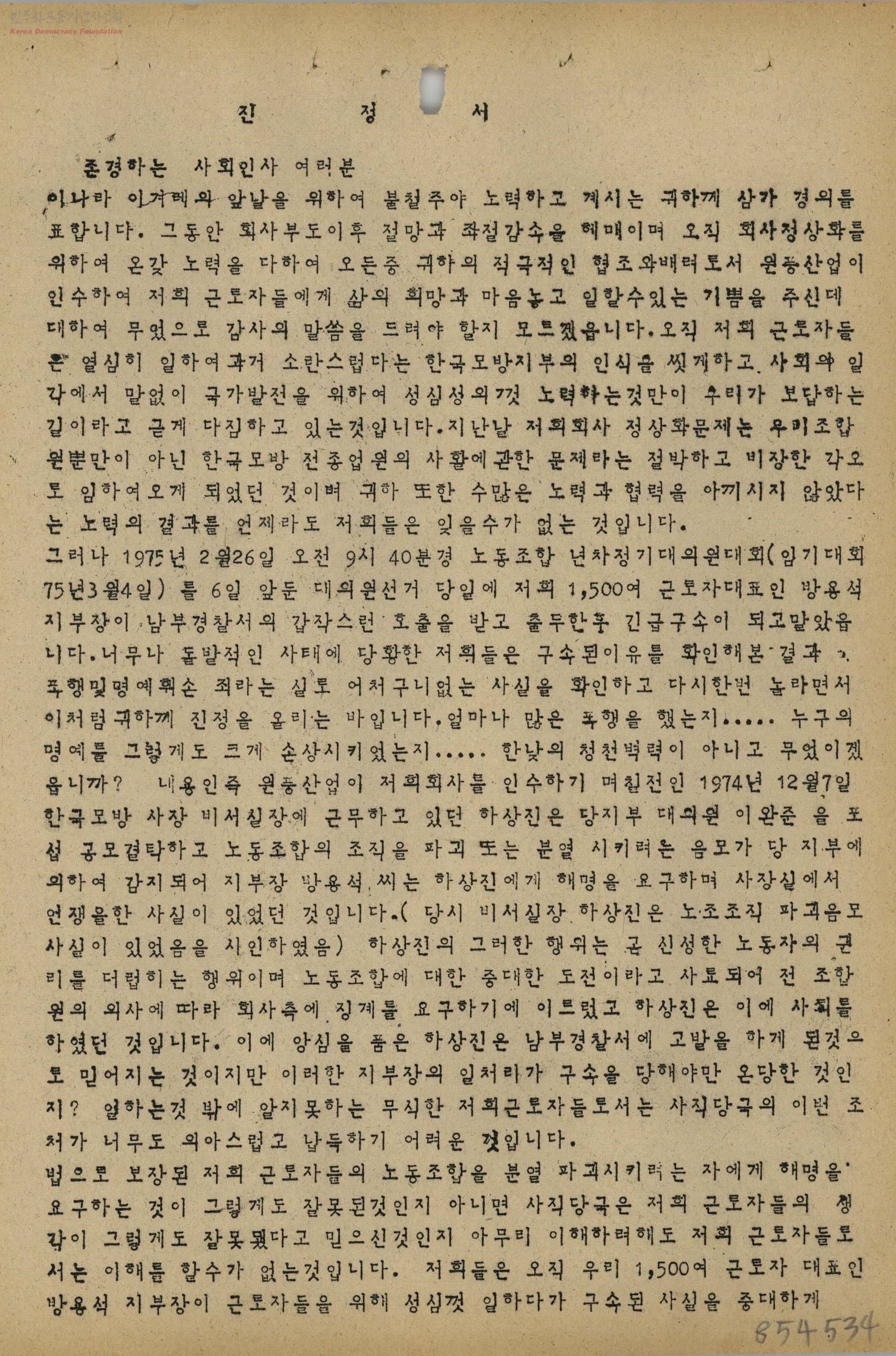 - 1975년 2월 26일 원풍산업 인수 직후 방용석 지부장의 구속과 관련하여 석방을 요구하는 내용