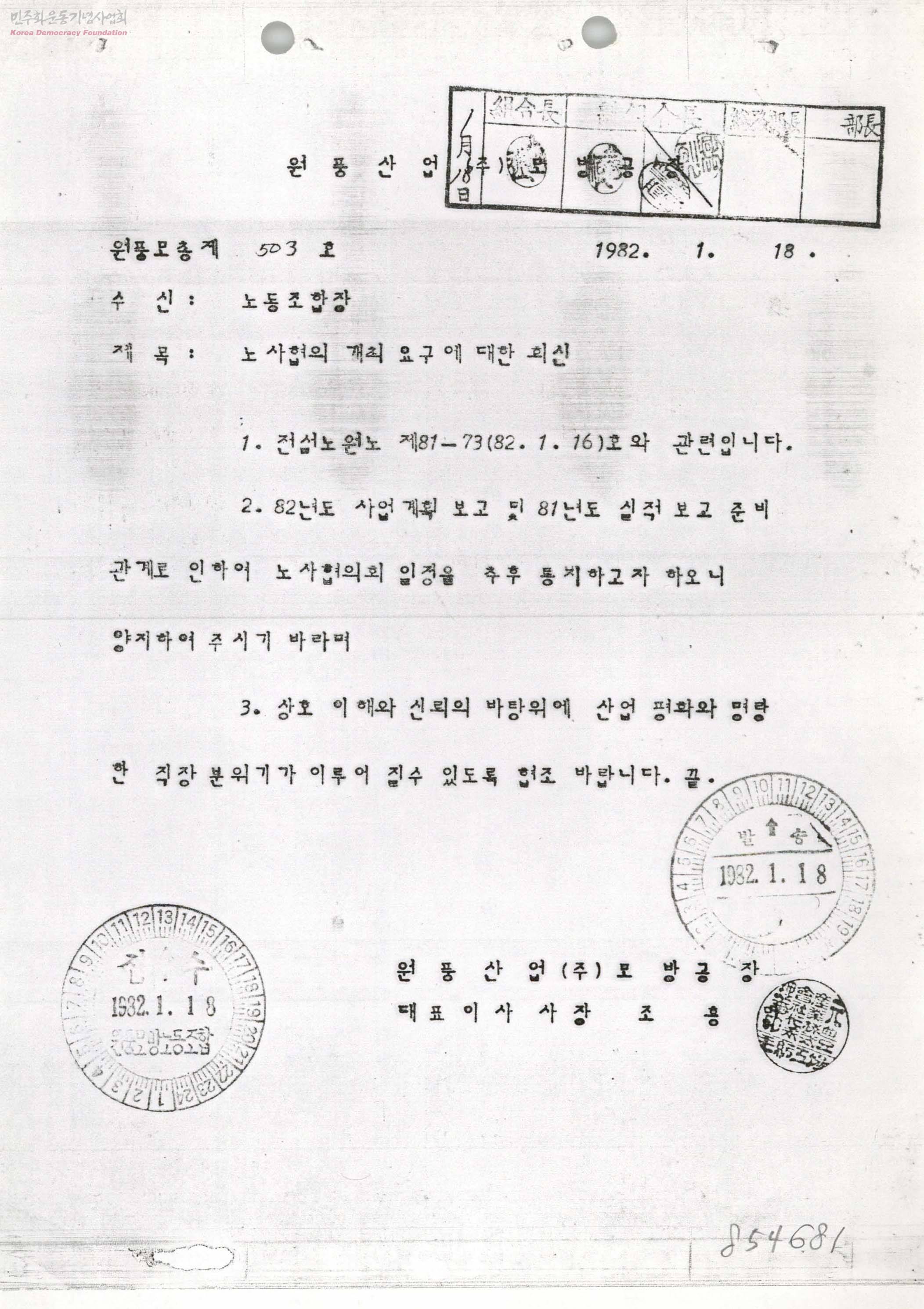 - 82년도 사업계획 보고 및 81년도 실적 보고 준비 관계로 인한 노사협의회 일정을 추후 통지하고자 하오니 양지하여 주시기 바라는 내용