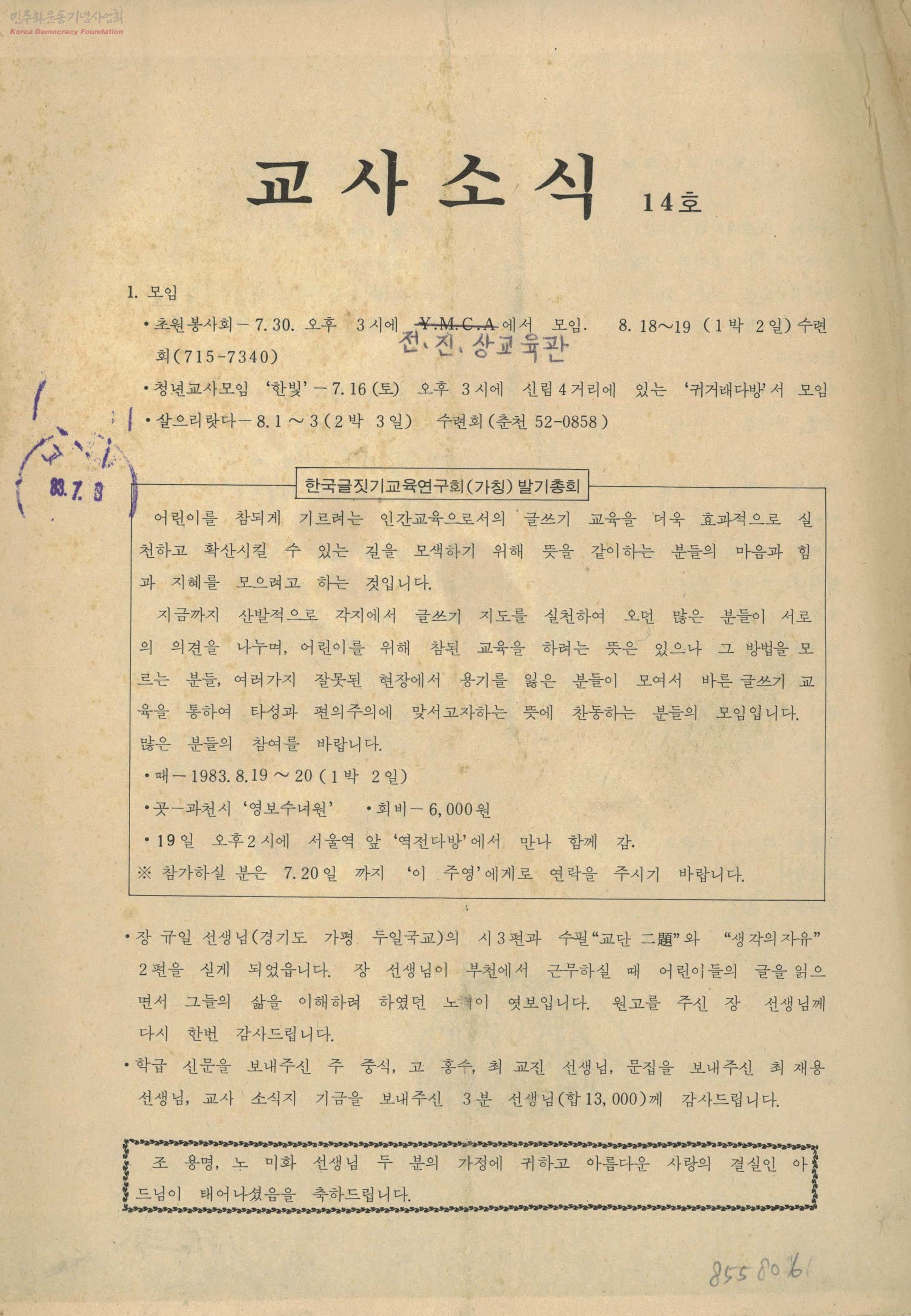 - 초원봉사회,청년교사모임 등의 모임 소식을 전하고 교단 二頭, 생각의 자유 등의 글을 수록 *우리 사회의 민주화를 교실에서부터 시작해야 한다고 생각한 교육민주화 운동 관련 자료