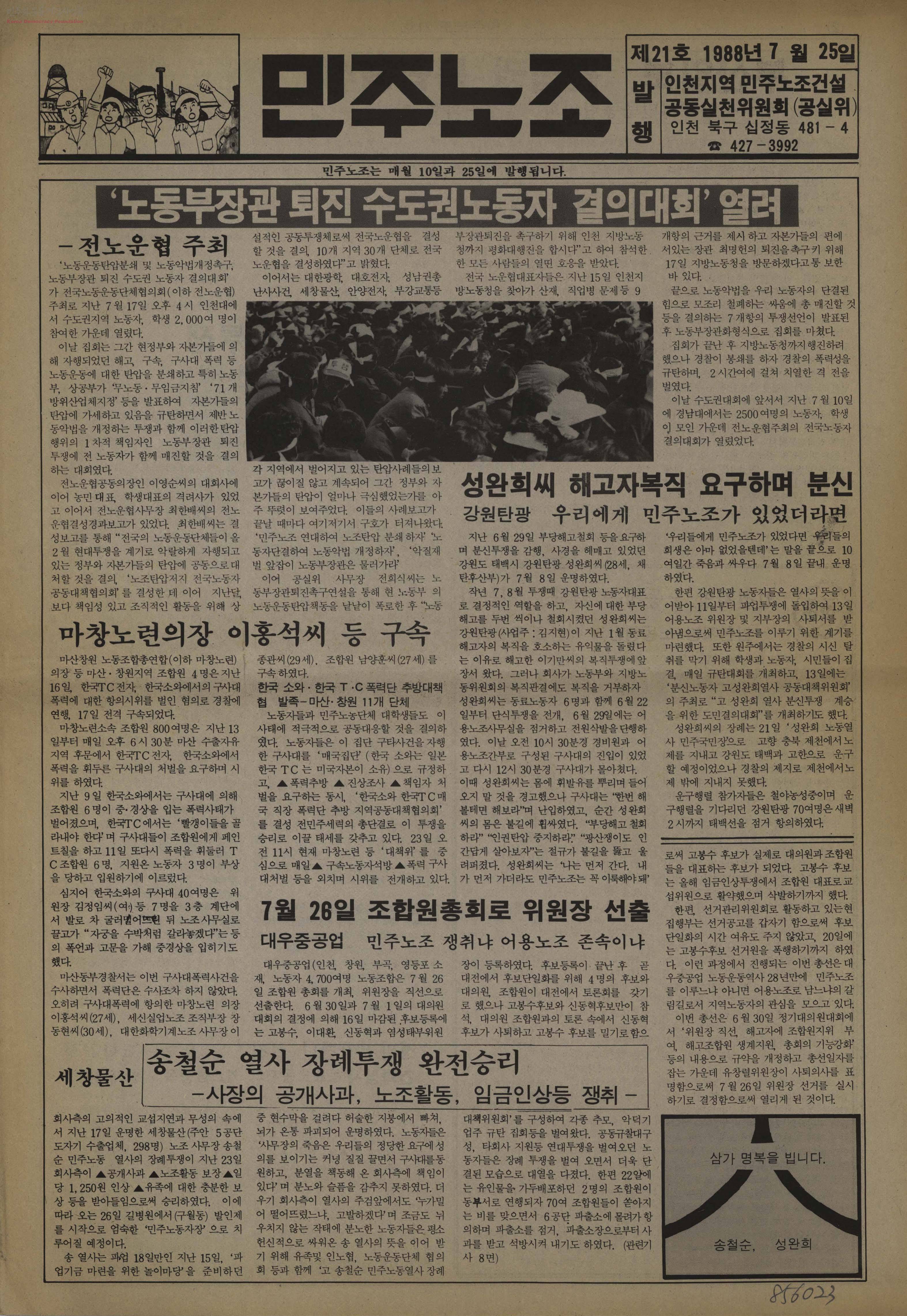 - 1988년 7월 인천민주노조건설공실위가 발행한 기관지 민주노조 제21호 1988년 7월 17일 인천대 '노동부장관 퇴진 수도권노동자 결의대회' 관련 기사, 송철순·성완희 열사 관련 기사 등 게재