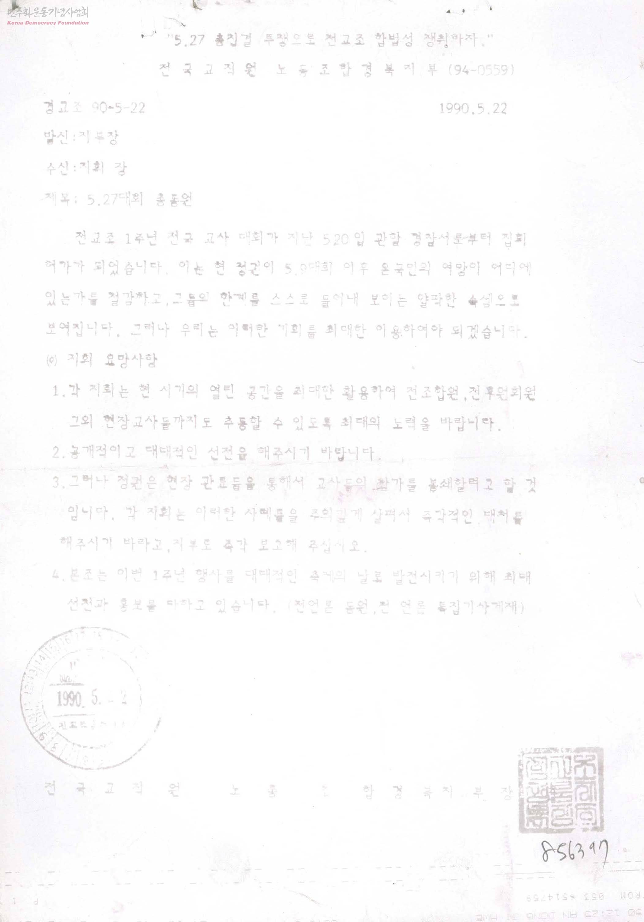 - 5월 20일 관할 경찰서 집회 허가 되어 전교조 1주년 전국 교사 대회 개최가 가능해졌기 때문에, 이 기회를 이용해 5.27대회를 대대적인 축제의 날로 발전 시키기 위한 선전과 홍보를 다하자는 내용