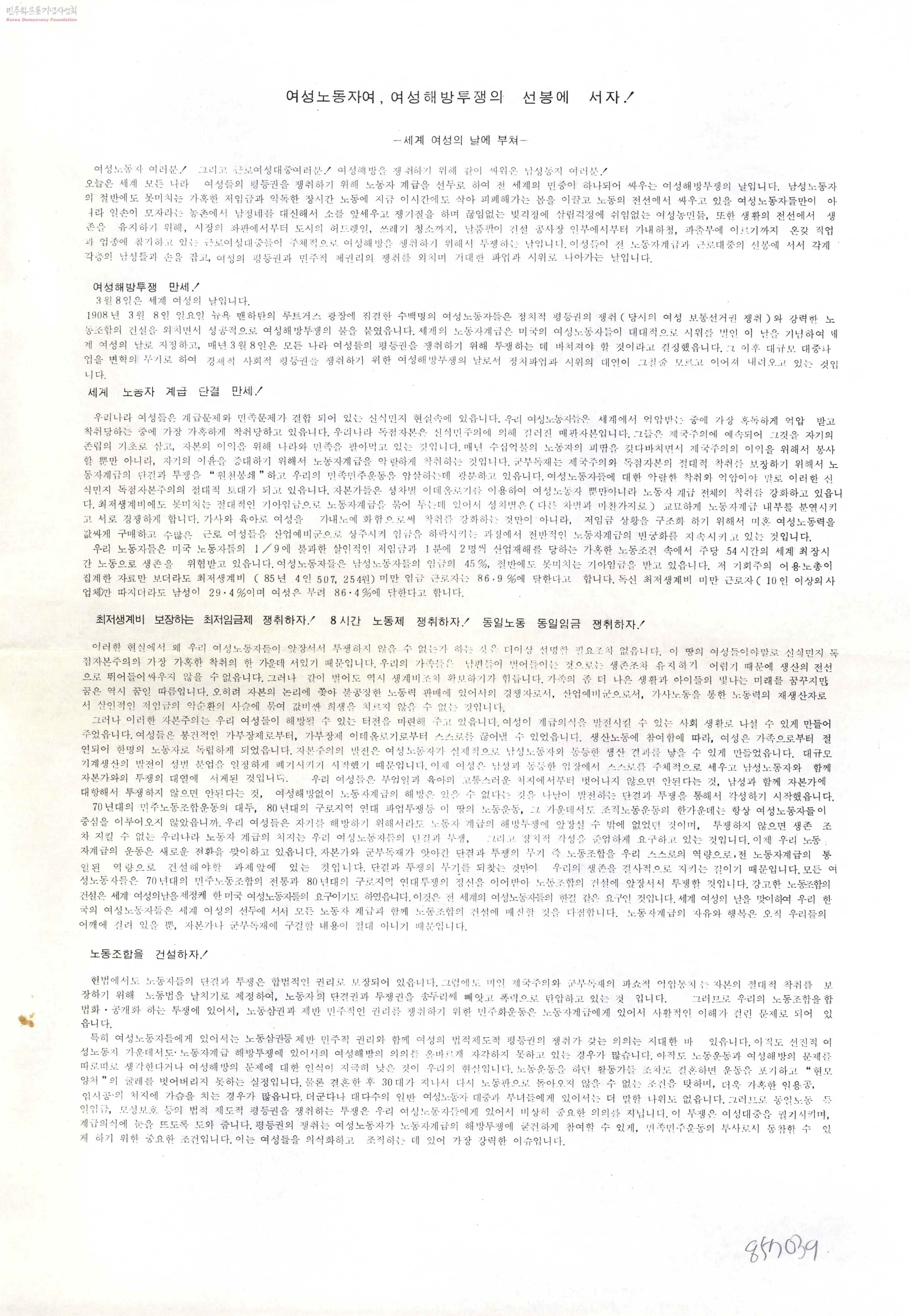 - 여성해방투쟁 만세! 세계 노동자 계급 단결 만세! 최저생계비 보장하는 최저임금제 쟁취하자! 8시간 노동제 쟁취하자! 동일노동 동일임금 쟁취하자! 등