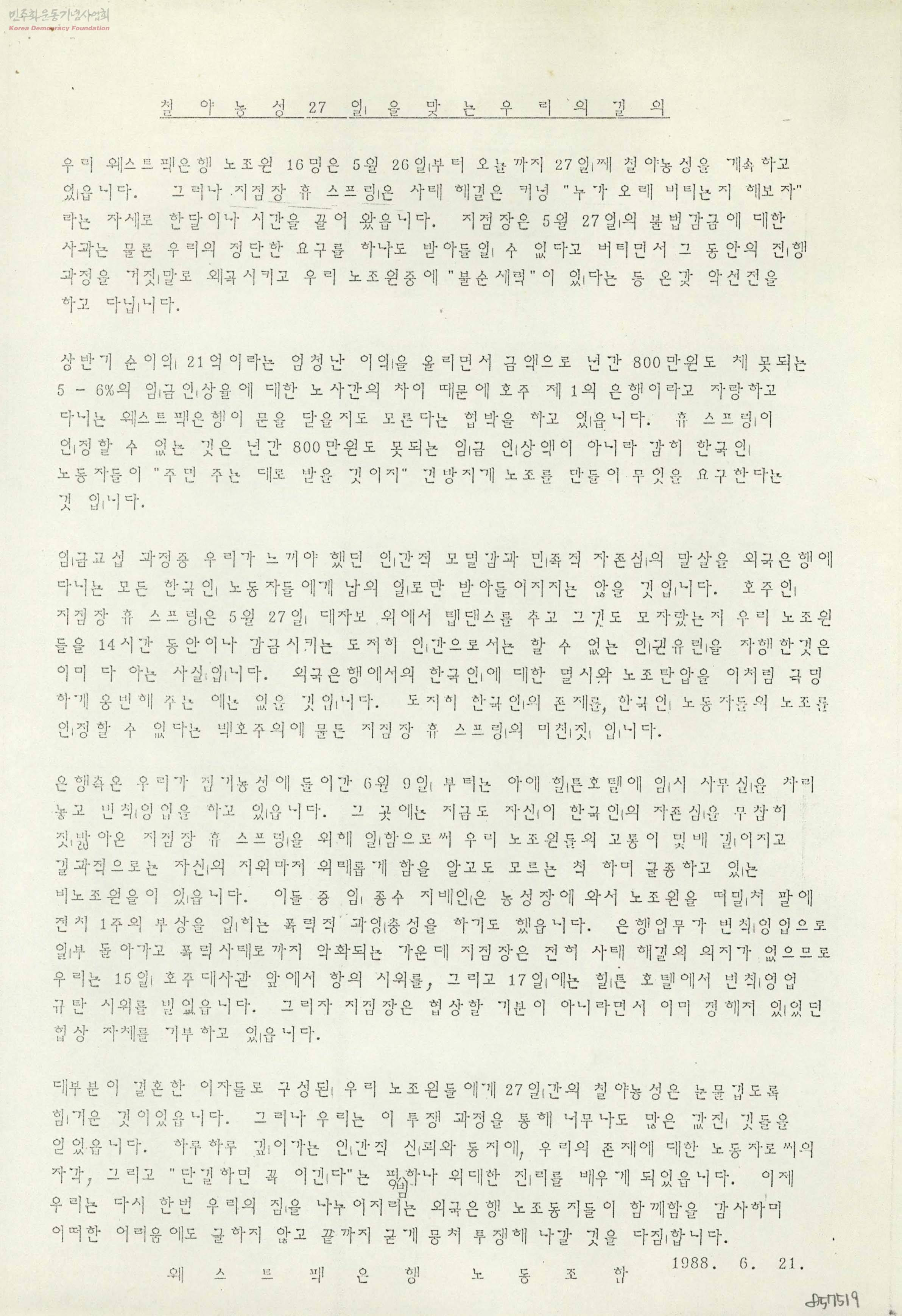 - 상반기 순이익 21억이 되나 임금인상율은 연간 800만원도 채 못 됨. 게다가 지점장 휴 스프링은 감히 한국인 노동자들이 건방지게 노조를 만들어 무언가를 요구한다고 생각함. 외국은행에서 한국인에 대한 멸시와 노조탄압, 감금 자행하고 있음.