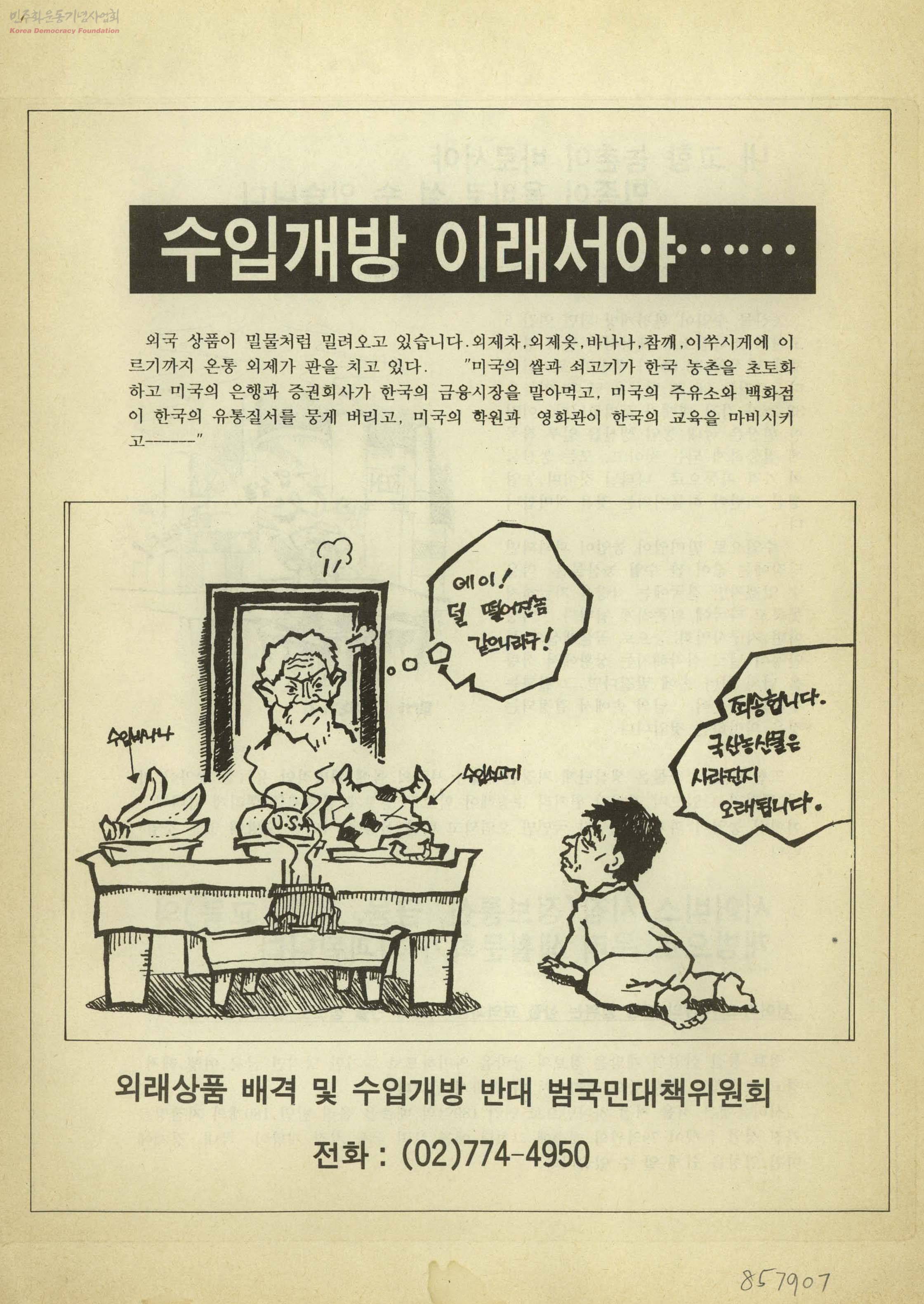 - 농산물수입개방, 서비스 시장 개방의 반대 및 미국의 내정간섭 중단 요구