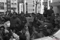 - 광주학살원흉인 군부독재 처단하자 기만적 합의개헌 분쇄하고 범국민 과도정부 구성하자 과도정부구성하며 자주민주정부 수립하자 미국을 몰아내자