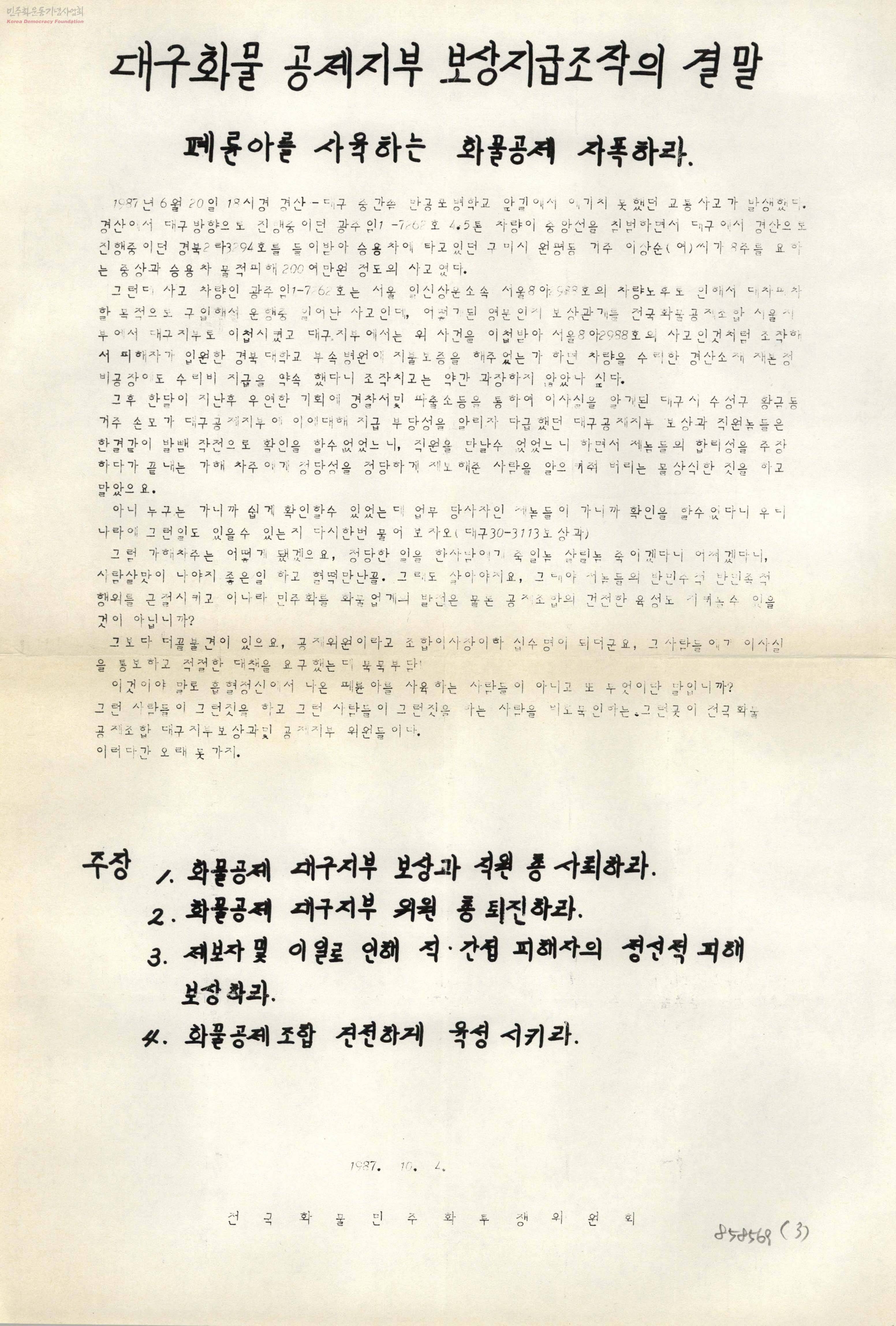 - 주장 1. 화물공제 대구지부 보상과 직원 총 사퇴하라 2. 화물공제 대구지부 위원 총 퇴진하라 3. 제보자 및 이일로 인해 직·간접 피해자의 정신적 피해 보상하라 4. 화물공제조합 건전하게 육성시키라 등