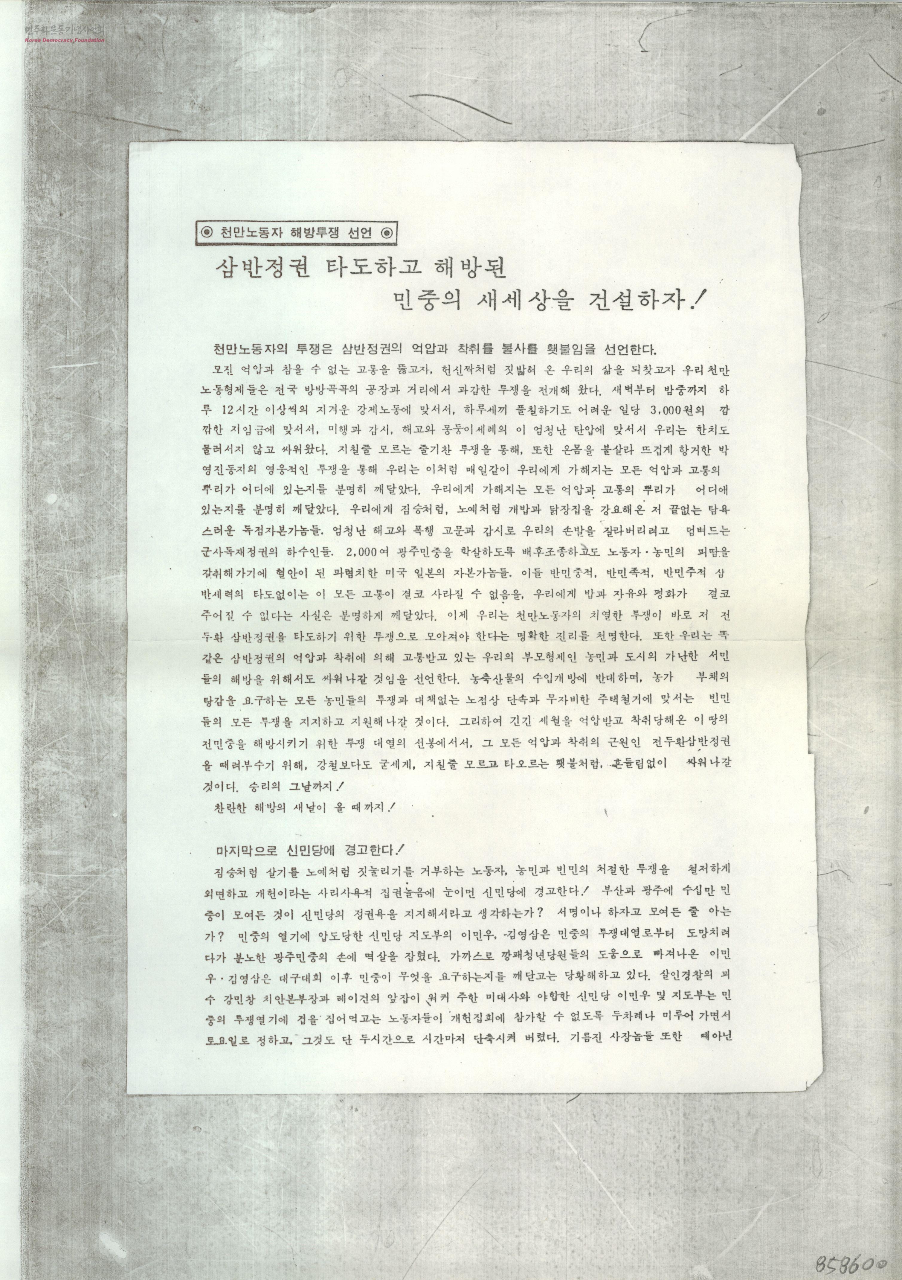 천만노동자 해방투쟁 선언-삼반정권 타도하고 해방된 민중의 새세상을 건설하자!