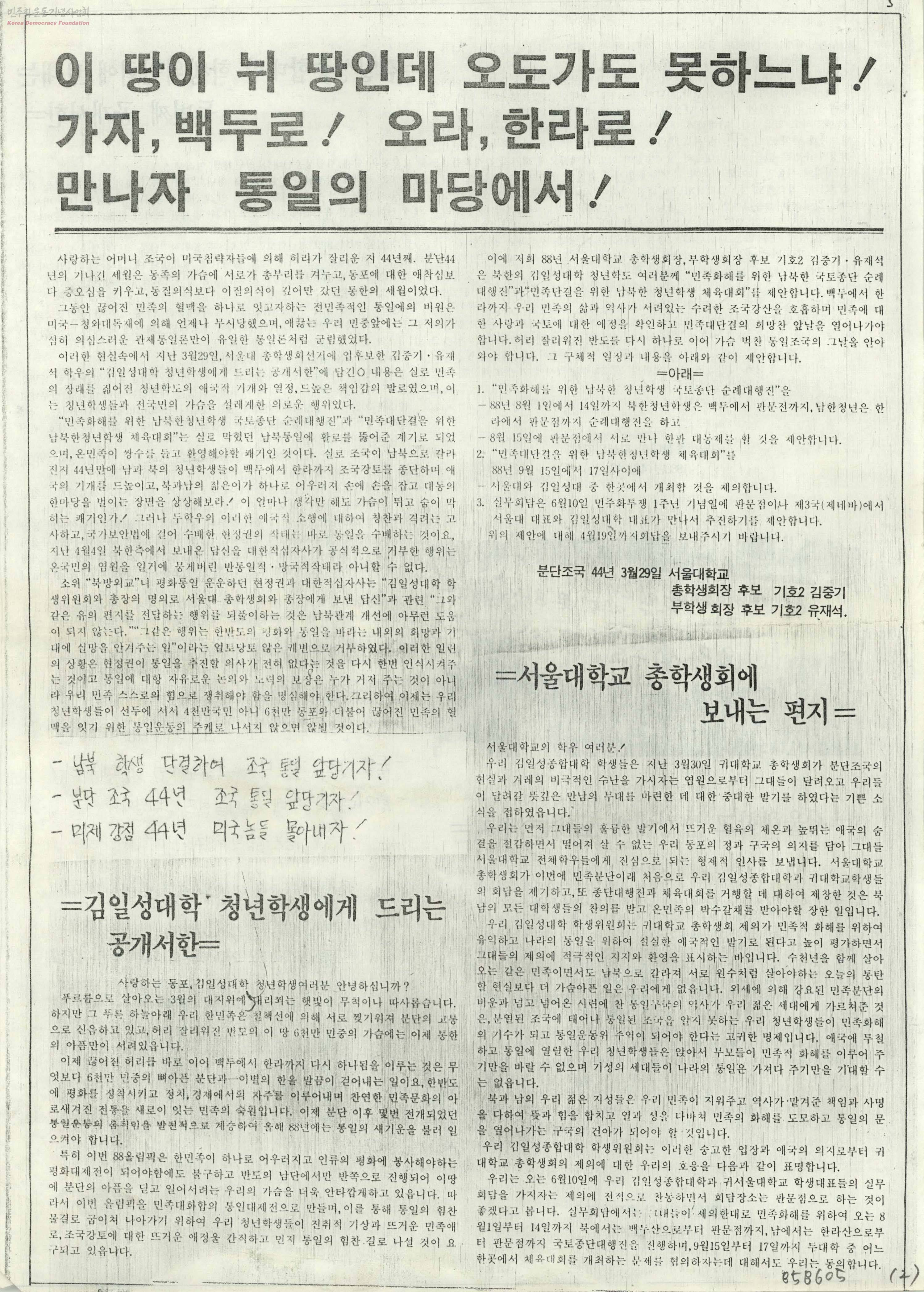 - - 김일성대학 청년학생에게 드리는 공개서한 - 서울대학교 총학생회에 보내는 편지 등.