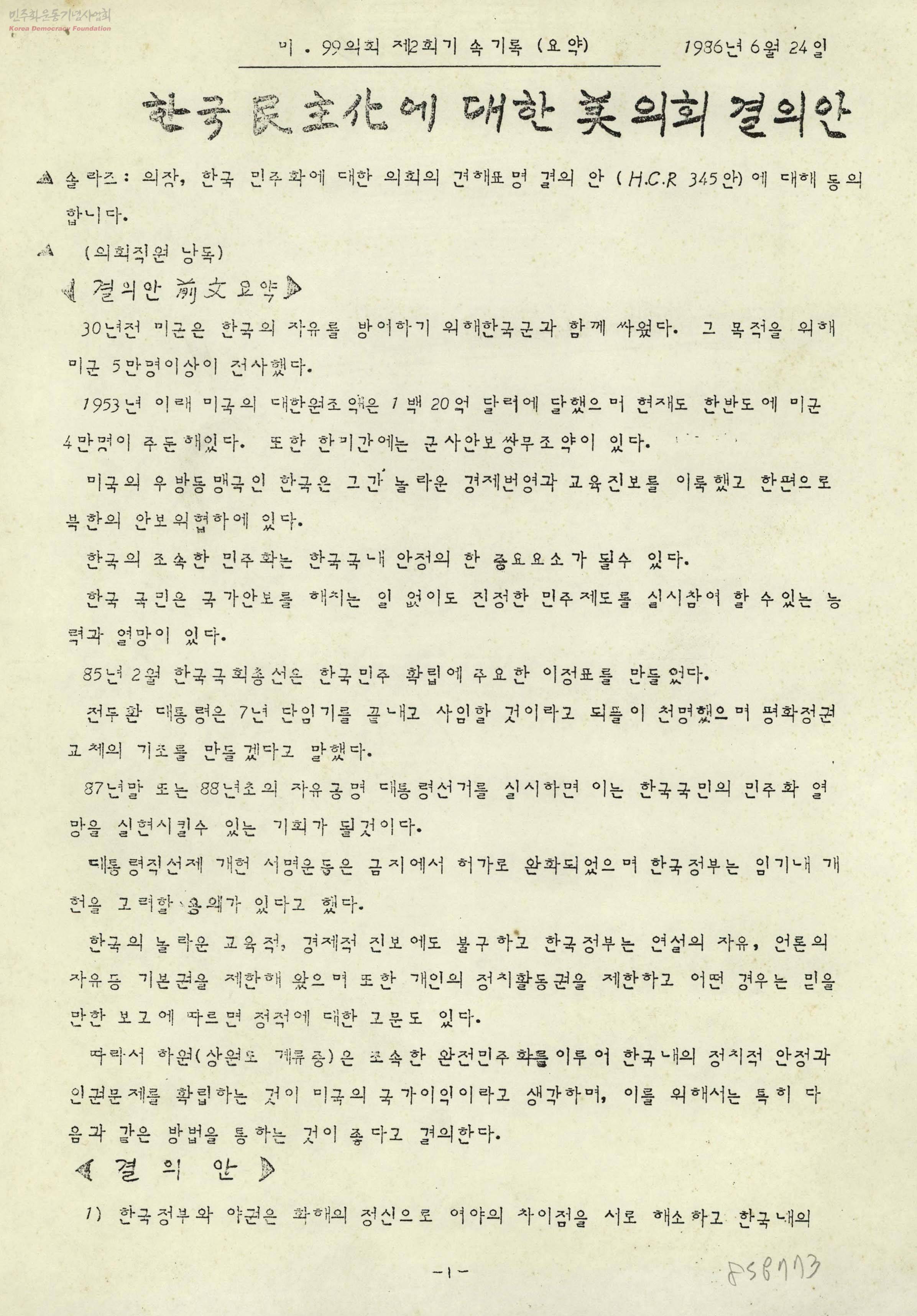 - 결의안 전문요약, 결의안 제출동기, 김대중씨 복권에 관한 내용