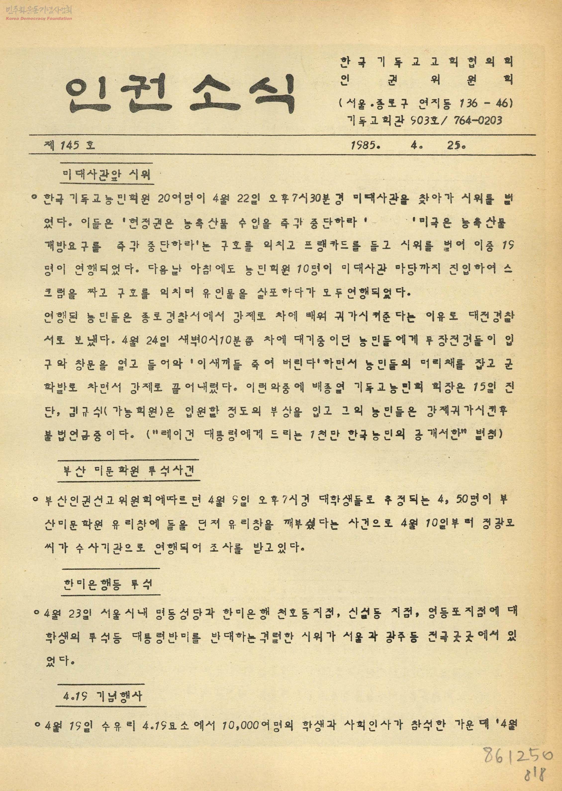 - 1985년 KNCC 인권위 발행 소식지 인권소식 제145호 1985년 4월 22일 농축산물 개방 반대 투쟁 관련 내용