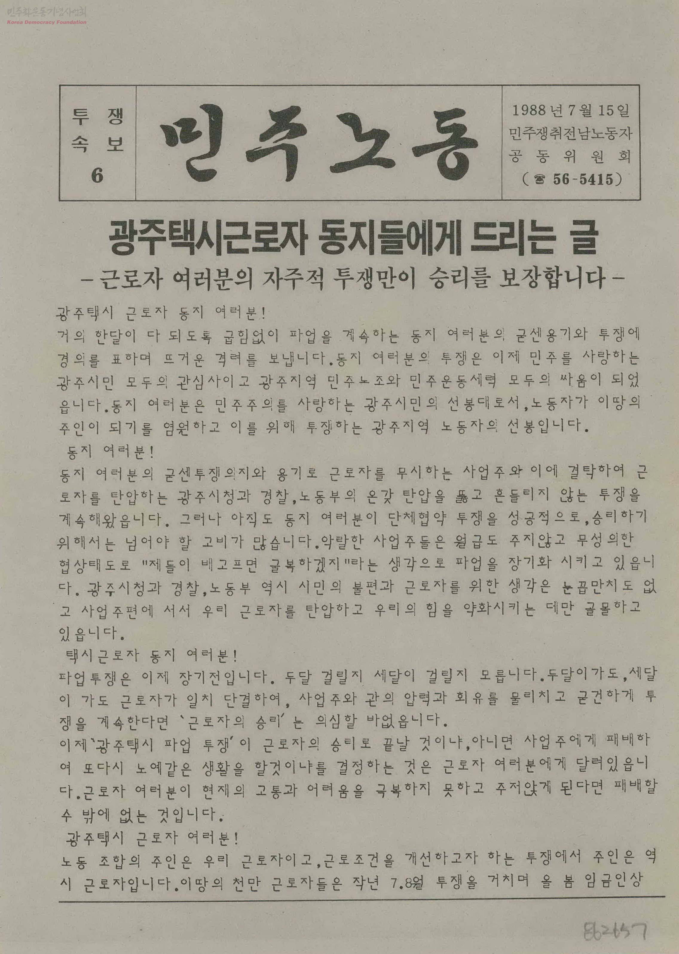 - 광주택시노동자 동지들에게 드리는 글 -근로자 여러분의 자주적 투쟁만이 승리를 보장합니다