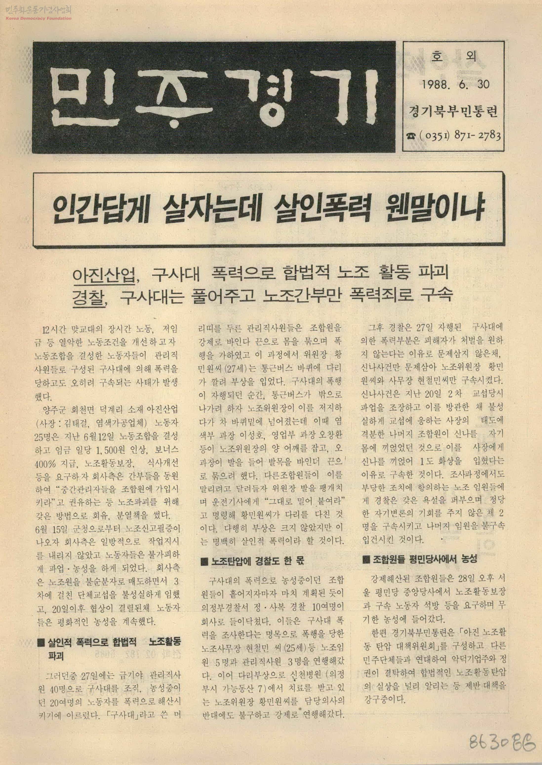 - 인간답게 살자는데 살인폭력 웬말이냐 아진산업, 구사대 폭력으로 합법적 노조 활동 파괴 경찰, 구사대는 풀어주고 노조간부만 폭력죄로 구속