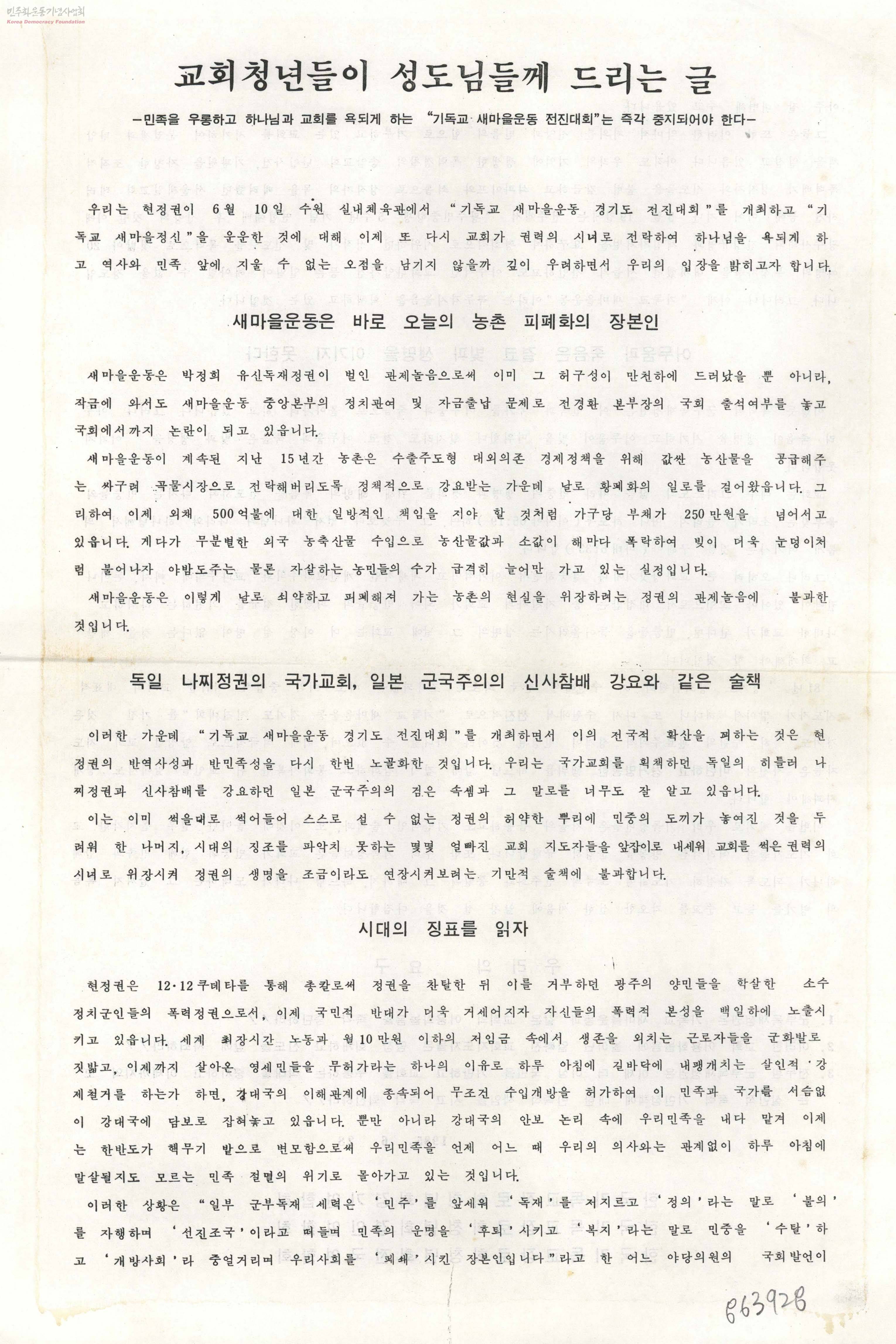 교회청년들이 성도님들께 드리는 글-민족을 우롱하고 하나님과 교회를 욕되게 하는 "기독교 새마을운동 전진대회"는 즉각 중지되어야 한다