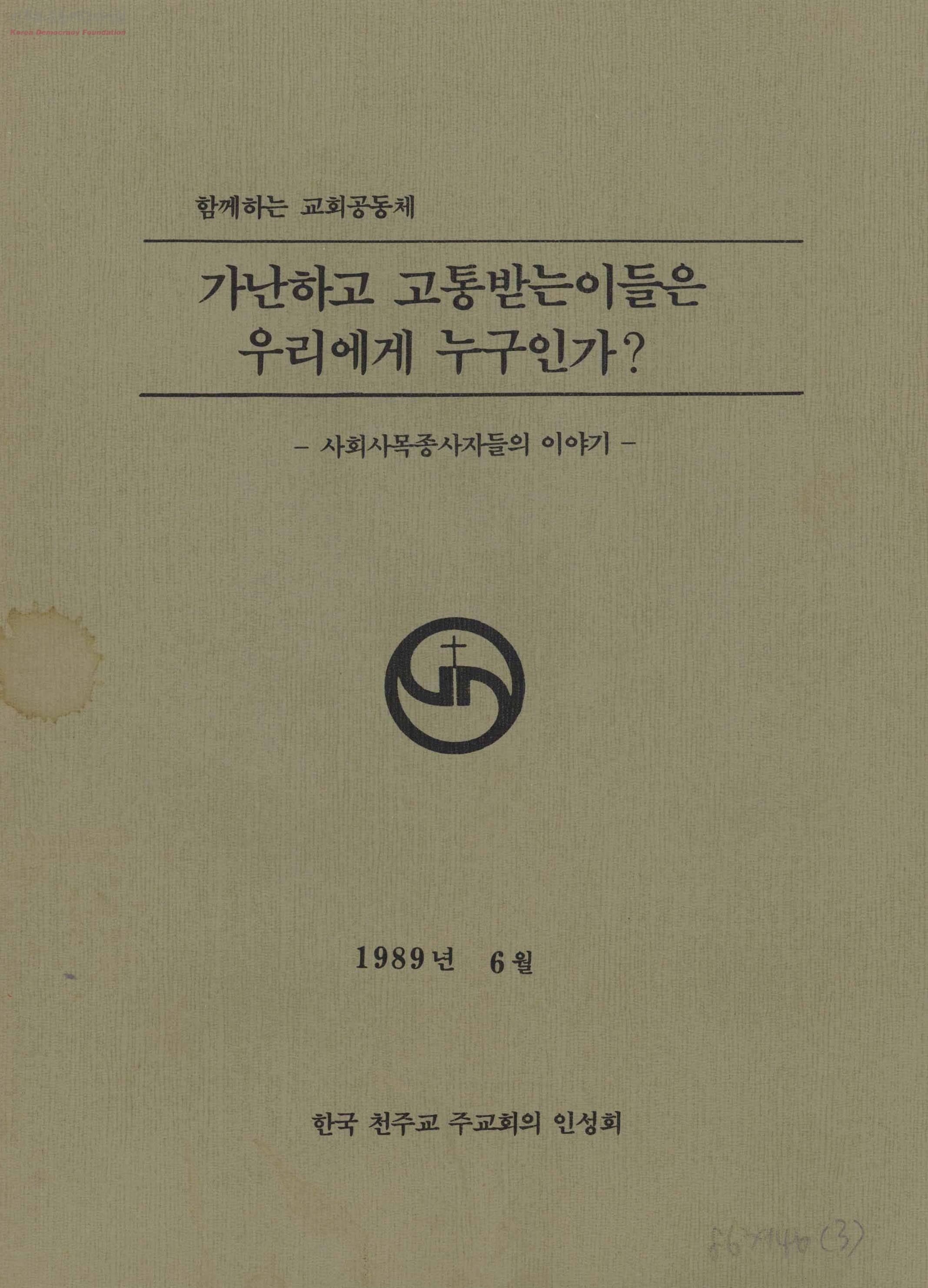 - 주교회의 산하 전국위원회 중 일개 위원회이며, 한국 전쟁 이후 남한 사회의 기층민중, 사회적 약자들의 문제를 비롯한 사회 구조적 모순의 문제들에 적극적인 입장을 표명하고, 이들에게 가톨릭 교회의 가르침 안에서 복음을 실천하려 한 '한국천주교 주교회의 인성회' 관련 내용. 차례-안내말씀, 제1부 가난한 이들에 대한 우선적인 선택-성서의 선택, 제2부 한국의 가난, 그 구조적 원인들, 제3부 가난한 이들안에 살아계시는 하느님, 제4부 가난한 이들 하느님과 함께하는 삶 등